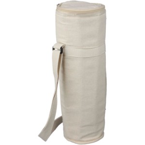 Palackhűtő táska cipzáras záródással, belsejében 2 mm EPE és 12C PEVA béléssel. Hosszú, állítható hordozópánttal. Kapacitás: 1,5 literes palack. Az oldalon újrahasznosított pamut anyagra utaló címkével. Anyaga: újrahasznosított pamut 270 g/m2.