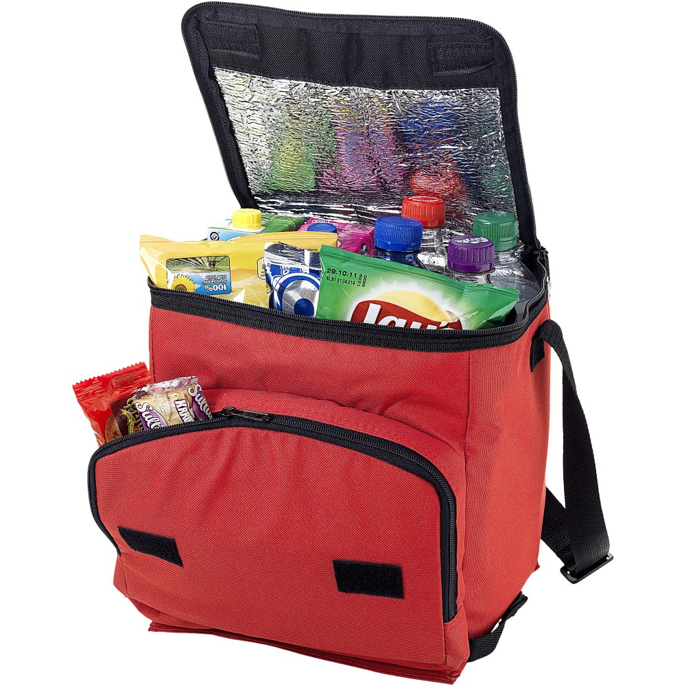 Összehajtható hűtőtáska cipzáras fő rekesszel és cipzáras elülső zsebbel. Állítható vállpánt. A hűtőtáska laposra hajtható az elülső zseben található horog és hurok segítségével. Egyéb kiegészítőt nem tartalmaz.