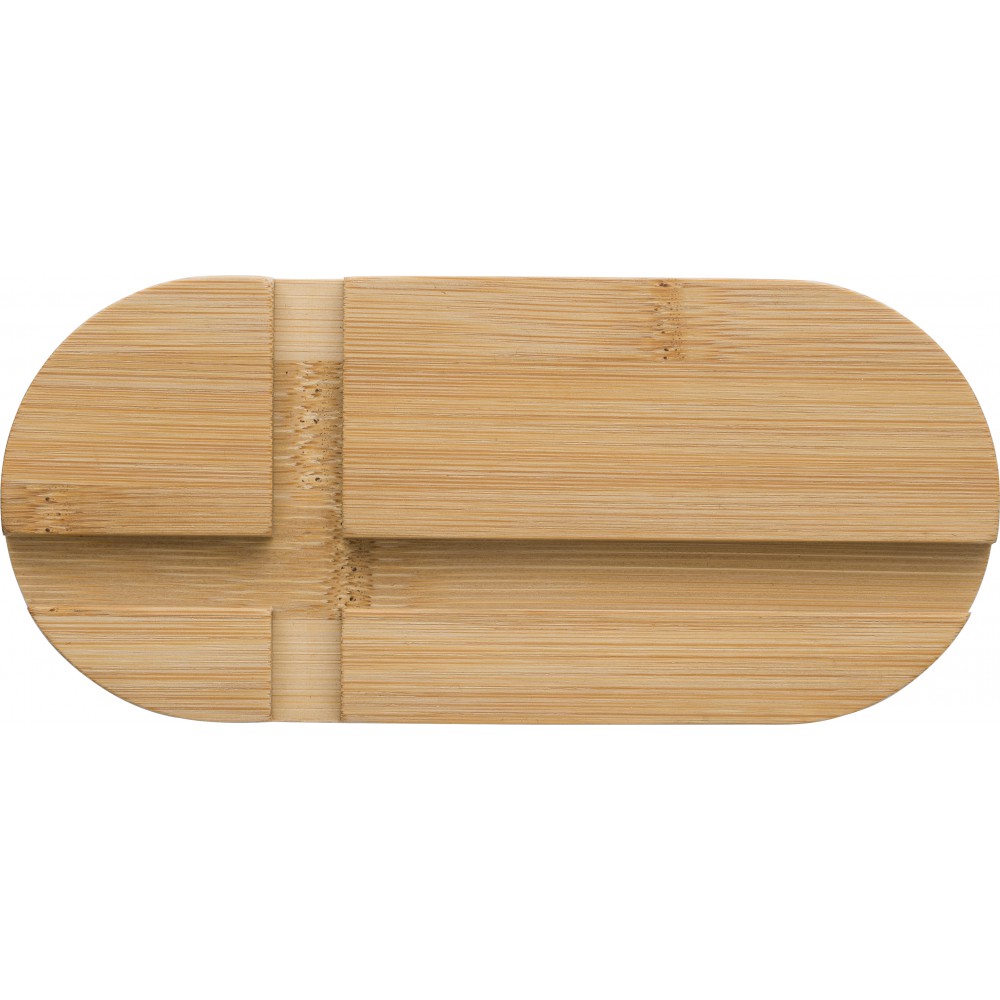 Bambusz telefon- és tablettartó. Csomagolása barna kartondoboz.
