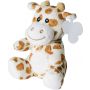 Plüss zsiráf hímzett szemekkel, fülében emblémázható címkével.