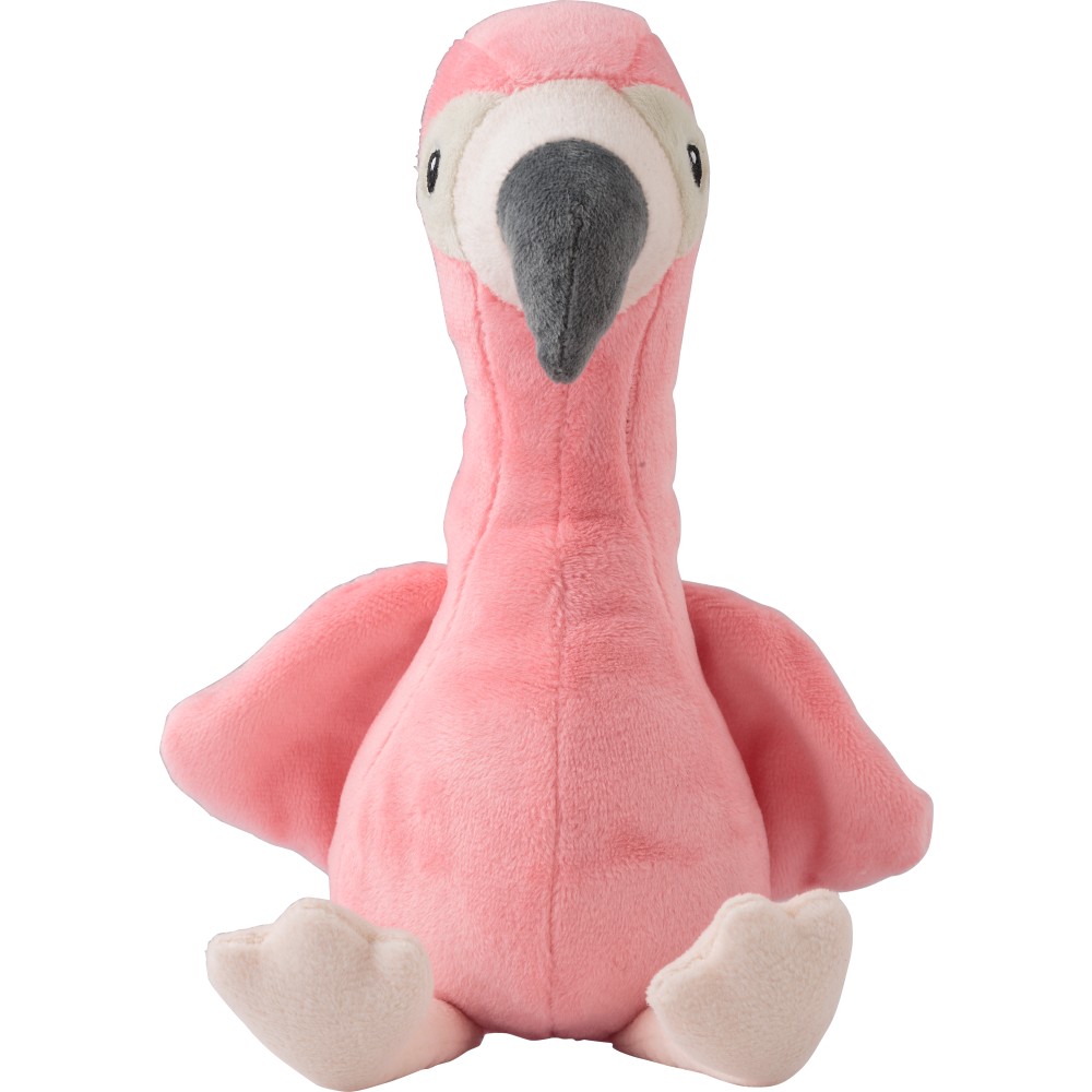 Plüss flamingó hímzett szemekkel. Emblémázásra alkalmas címke.