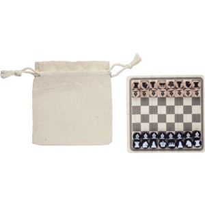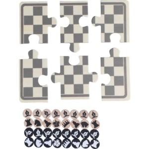Fa sakk- és dámajáték pamut zsinóros tasakban. Tartalmaz egy 6 darabból álló, nyomtatott puzzle-t, amely összerakható a játéktábla létrehozásához, valamint 16 nyomtatott fa zsetont, amelyek sakkfigurákat ábrázolnak. A játéktér anyaga rétegelt lemez, a zsetonok anyaga fenyőfa.