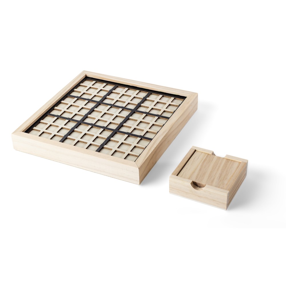 Fenyőfából készült mini Sudoku játék, felnyitható játéktáblával és belső tárolórekesszel 16 darab játéktüske számára. Kompakt kivitel, útközbeni használatra alkalmas. Darabonként barna kartondobozba csomagolva.