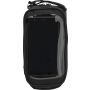 Kormányra szerelhető biciklistáska fényvisszaverő csíkokkal, telefontartóval. A PVC telefontartó zseb nem akadályozza az értintőképernyős telefonok kezelését sem. A táska egyik oldalán nyílás található a fülhallgató kivezetéséhez. A kormányra tépőzárral rögzíthető. 600D poliészter és PVC.