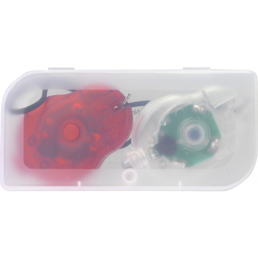 Biciklislámpa szett. 2 db mini biciklislámpa 1-1 LED fénnyel, átlátszó dobozban.