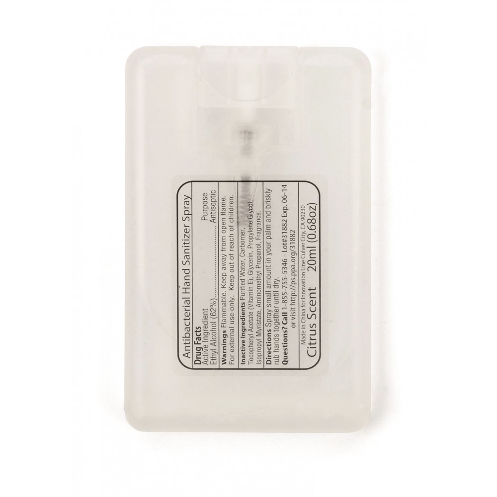 Kéztisztító spray áttetsző flakonban, 20 ml. Alkoholtartalom: 62%. Veszélyes áru, csomagban nem küldhető.