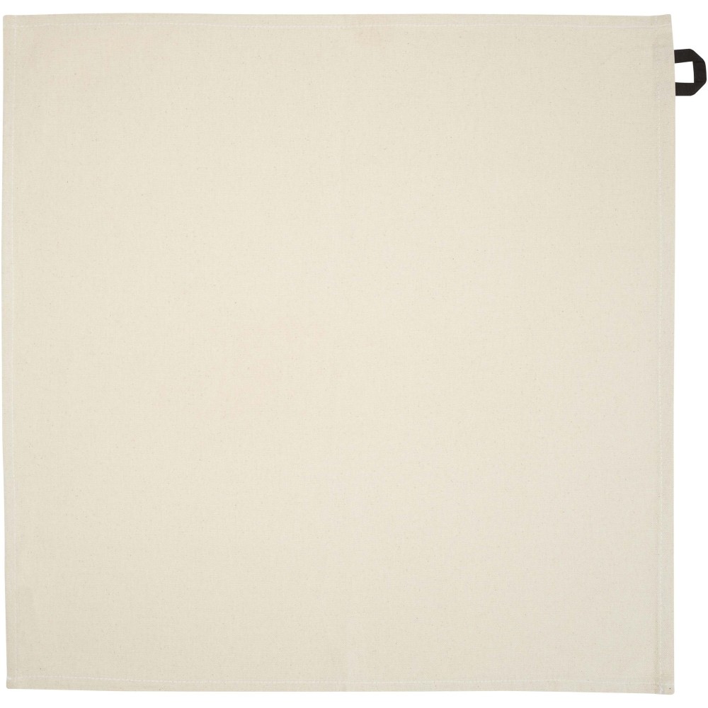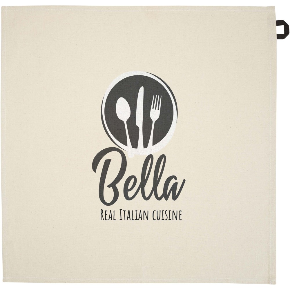 Konyharuha 100% GRS tanúsítvánnyal, 200 g/m2 újrahasznosított pamutból készült, és jellegzetes kontrasztos akasztóval rendelkezik. Mérete: 50 x 50 cm.