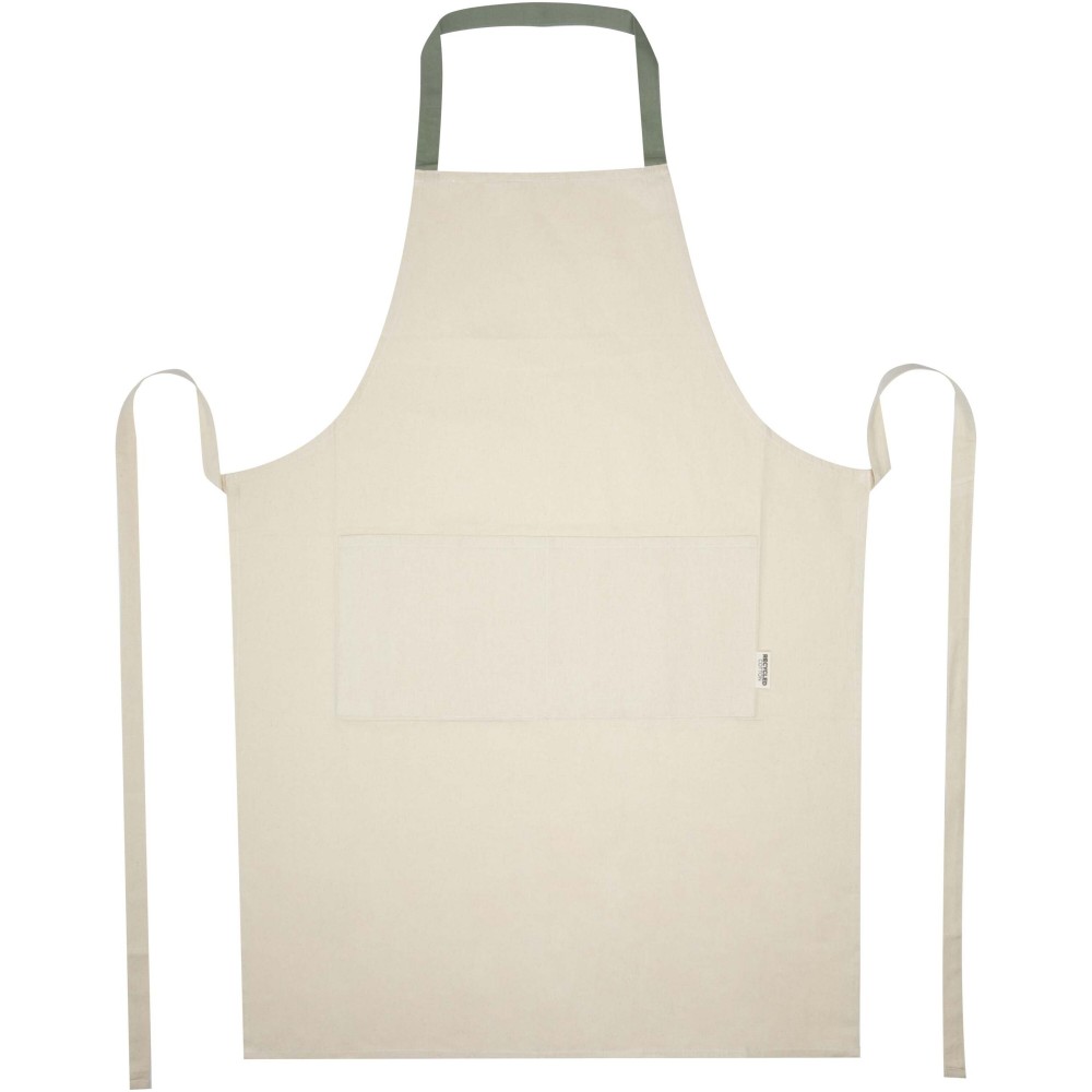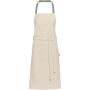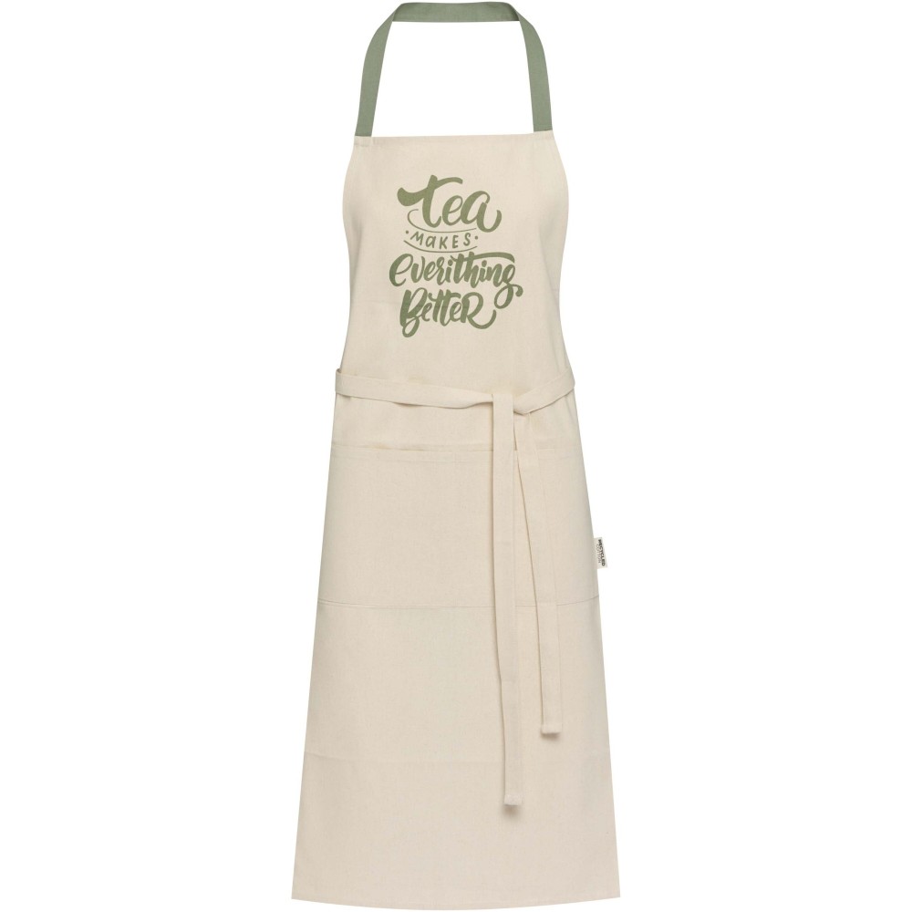 A Nia kötény 100% GRS tanúsítvánnyal rendelkező, 200 g/m2 újrahasznosított pamutból készült. Természetes pamut színe és kontrasztos nyakkpántja elegánsan védi ruhádat főzés közben. Két egymás melletti zsebbel rendelkezik, összesen 45 x 20 cm-es mérettel, és 1 méter hosszú pánttal rögzíthető hátul.