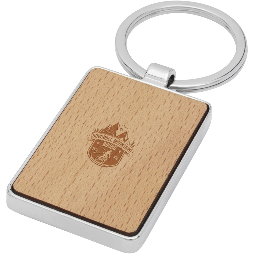 Téglalap alakú kulcstartó bükkfa és cink ötvözet burkolattal, barna tasakban. A felület mérete: 4 x 4 cm. Kiválóan lézergravírozható. 90% bükkfa és 10% Cinkötvözet.