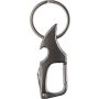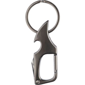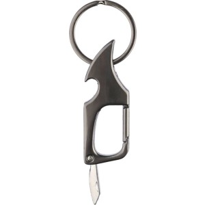 Karabiner kulcstartó sörnyitóval és kis késsel. A kulcstartó fém része elektrolizált. Egyenként barna papírzacskóba csomagolva. Anyaga: fém.