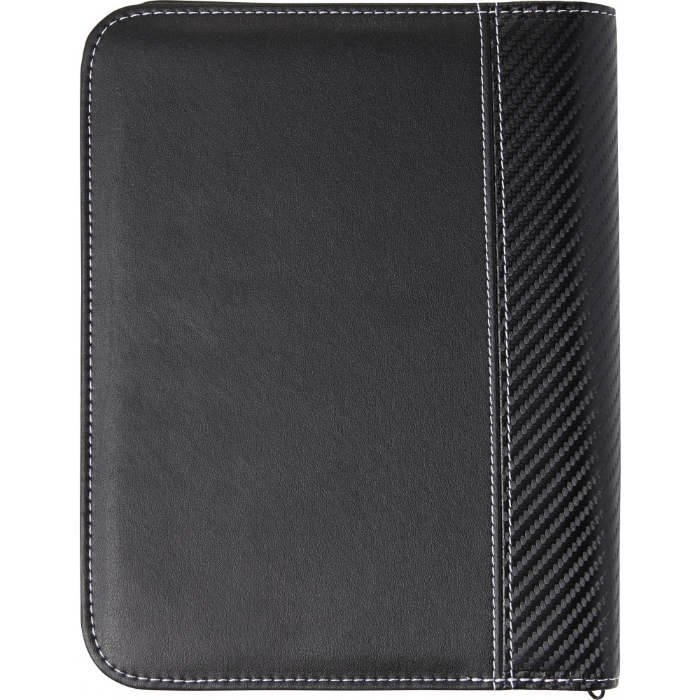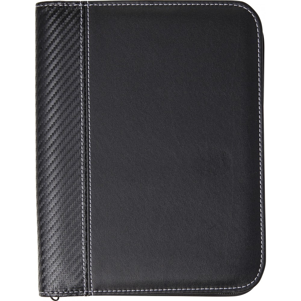 Cipzáros A5 irattartó PU borítással, fehér díszítő tűzésekkel, tolltartó hurokkal, hat különböző méretű zsebbel, 30 lapos, vonalas jegyzettömbbel, mikroszálas béléssel. A tollat nem tartalmazza.