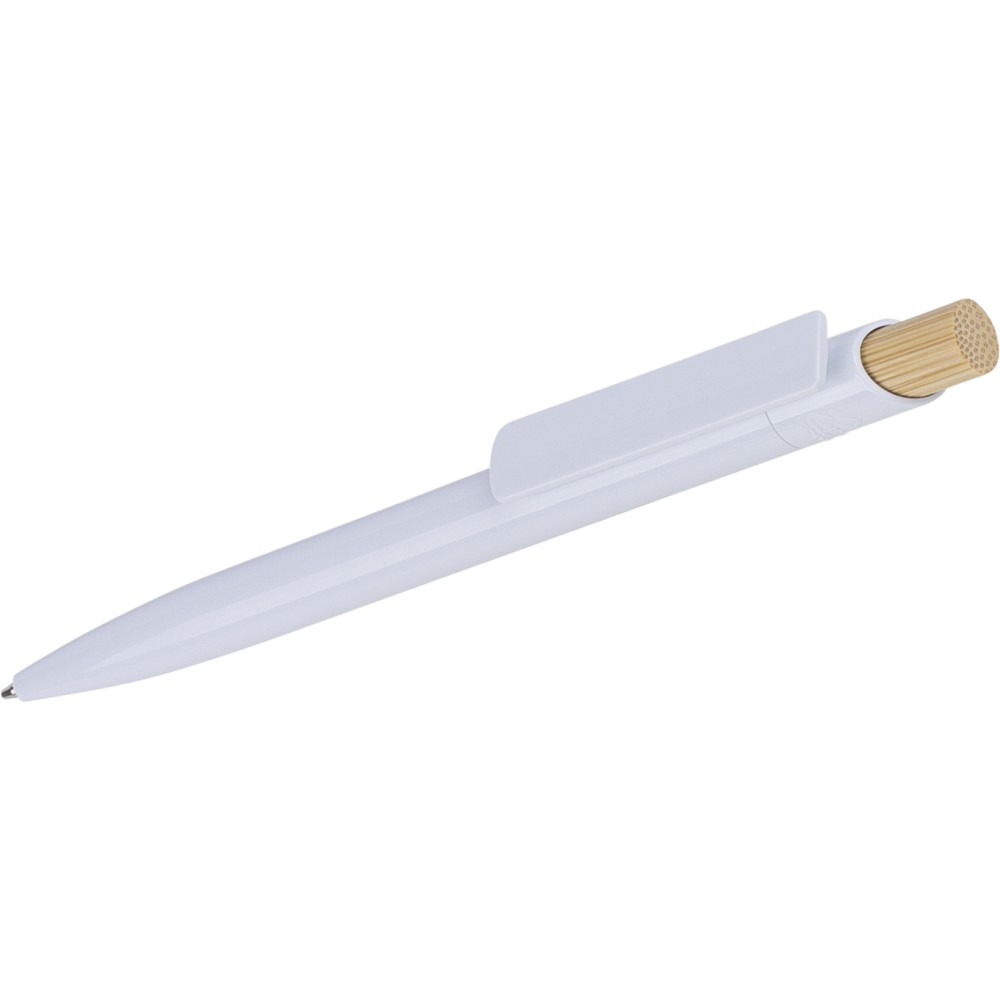 Újrahasznosított ABS-ből készült golyóstoll bambusz nyomógombbal és fehér klippel, digitális nyomtatásra alkalmas kivitelben. A tolltesten fröccsöntés során elhelyezett recycled (újrahasznosított) alapanyagra utaló logó található. Megközelítőleg 600 méter íráshosszúságú, kék színű tollbetéttel.