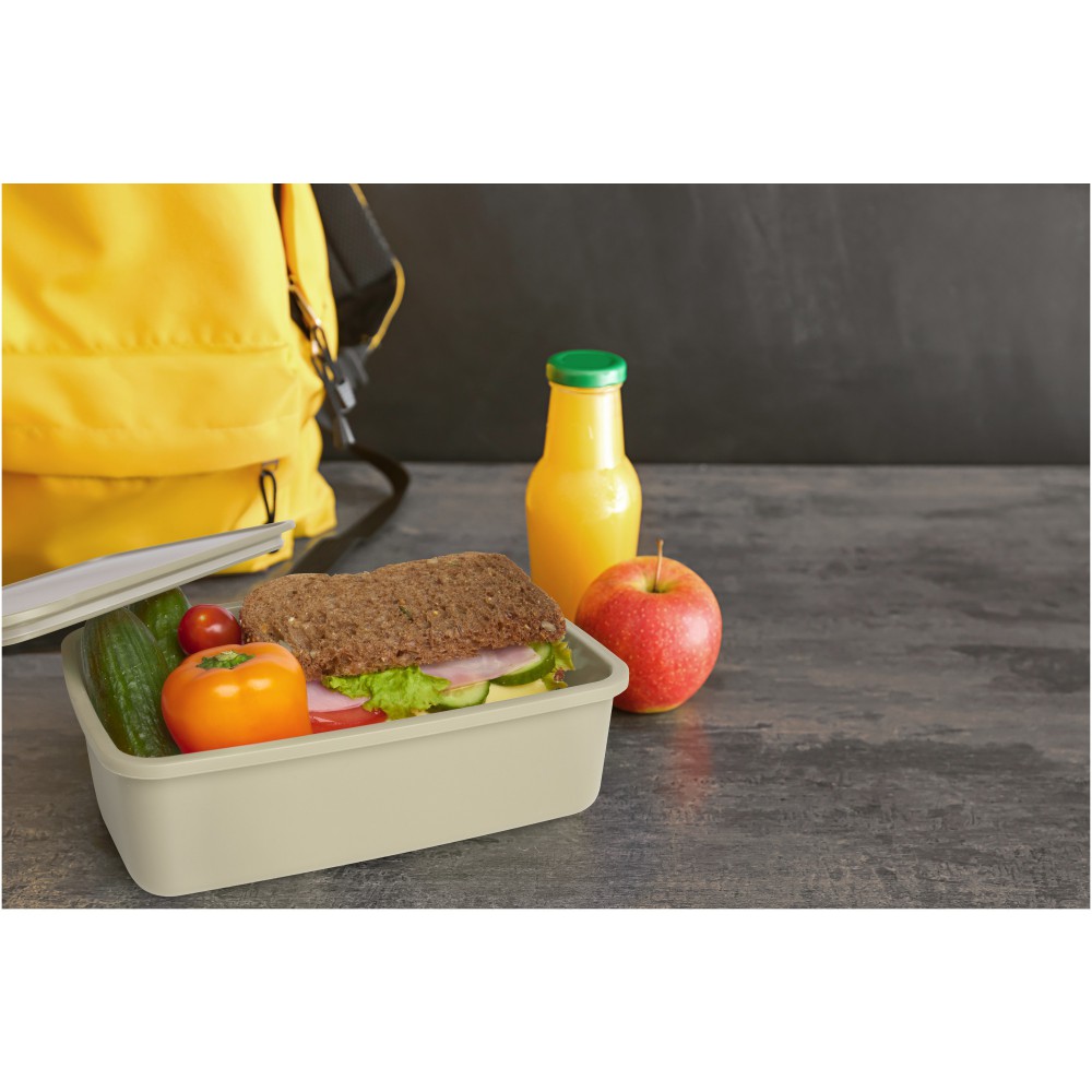 A 800 ml-es Dovi ebéddoboz 100%-ban újrahasznosított műanyagból készült, így fenntartható és trendi választás. Elasztikus szalaggal záródik, amely biztonságosan a helyén tartja a fedelet útközben.