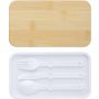 Kétrétegű uzsonnásdoboz több rekesszel (2 x 400 ml) és bambuszfedéllel. Tartalmazza az elválasztót és a műanyag evőeszközöket (kanál, villa és kés), valamint a rugalmas szalagot. PP.