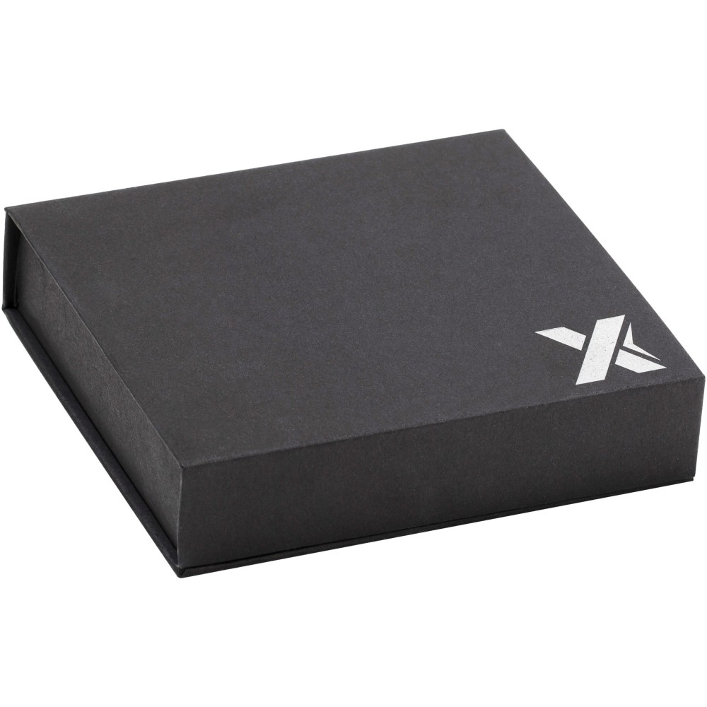 10 W-os vezeték nélküli töltőállomás világító logóval és antibakteriális kezeléssel, újrahasznosított PET-ből készült töltőkábellel. Újrahasznosított papírból készült fekete díszdobozban, mágneses zárószerkezettel szállítjuk. EUROPE EUIPO szabadalom.