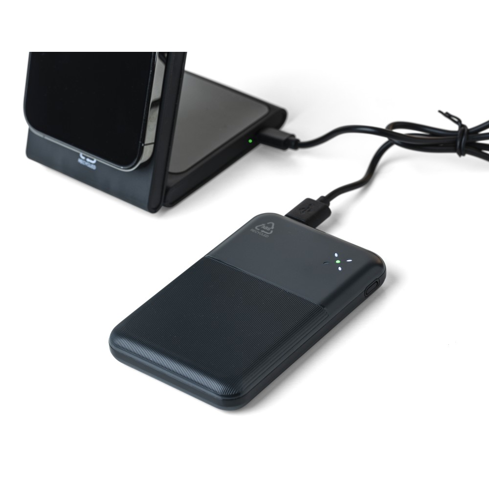 Újrahasznosított ABS anyagból készült powerbank 10 000 mAh kapacitással és 22,5 W gyors töltési teljesítménnyel. Type-C in/out és Type-A bemenettel, digitális kijelzővel, sima és texturált felülettel. Biztonsági védelmekkel ellátva. A hátoldalon gravírozott recycled (újrahasznosított) alapanyagra utaló logó található. Selyempapírral bélelt barna dobozba csomagolva.