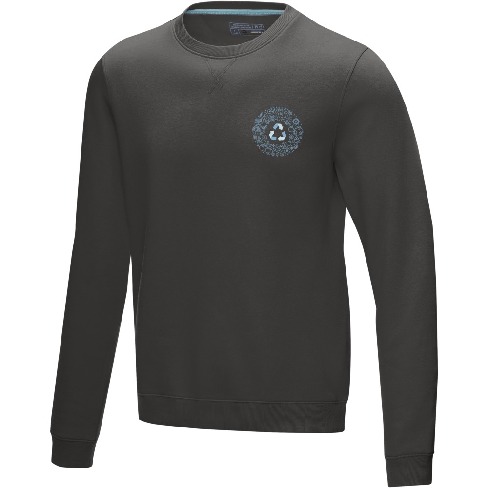 Kereknyakú pulóver fenntartható, tanúsított organikus pamutból és újrahasznosított poliészterből. V alakú betét a nyaknál. Belül bolyhos, puha anyag. Bordás nyak- alj-, és ujjpasszé. Kétszínű, márkázott szalagerősítés a nyakban. Félhold alakú betét a nyakban. 80% tanúsított organikus pamut és 20% tanúsított újrahasznosított poliészter, 280 g/m2.
