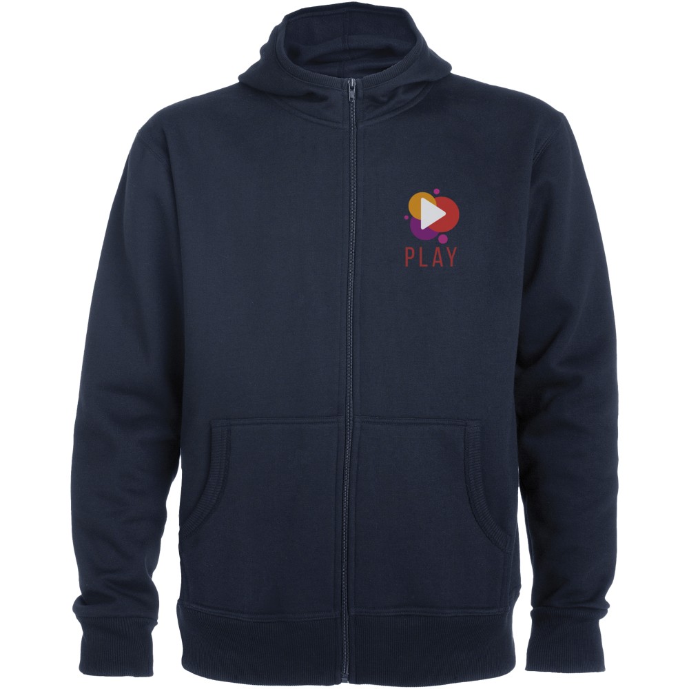 Magasnyakú, kapucnis pulóver teljes cipzárral. Bordázott részletek a kapucni és a zsebek szélén. Kenguru stílusú zseb. 2x2-es bordás kézelő és nyakpasszé. Gyerekméretekben is kapható. 50% pamut és 50% poliészter, 280 g/m2.