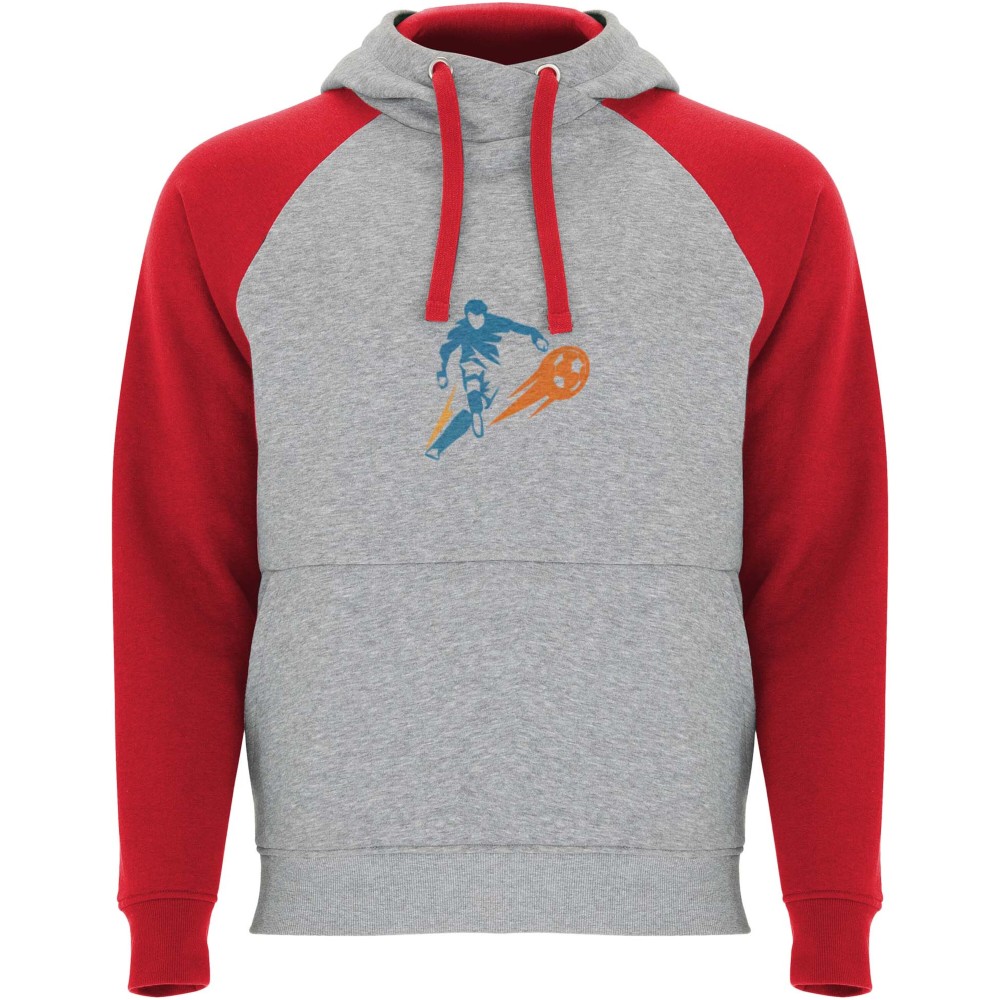 Két színű uniszex kapucnis pulóver. Kapucni keresztezett nyakrésszel és fém kiegészítőkkel. Kontrasztos belső rész a kapucnin, húzózsinór és raglán ujjak. Kenguru zseb. Rugalmas 1x1 passzék és alj. Levehető címke.