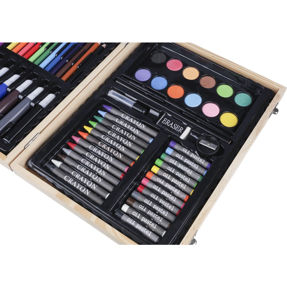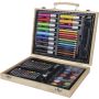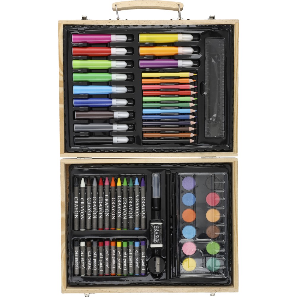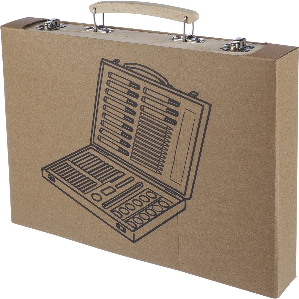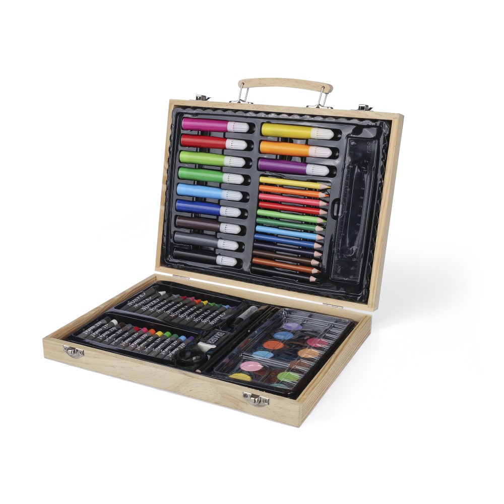 66 db-os rajzkészlet fa tartóban, fa fogantyúval. Tartalma: 12 db zsírkréta, 12 db színes filctoll, 12 db kihegyezett színesceruza, 12 db olajpasztell kréta, 12 db festék, ragasztóstift, radír, ceruzahegyező, vonalzó, ecset és festőpaletta. Csomagolása barna papírdoboz.