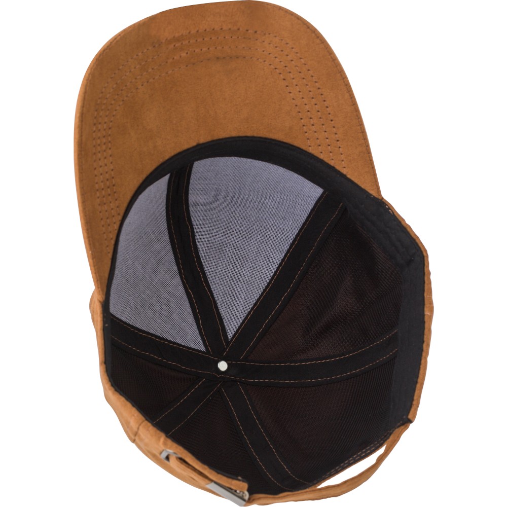 Hatpaneles velúr sapka, hátul fémcsatos záródással. Szellőzőlyukak a panel elülső, felső oldalán.