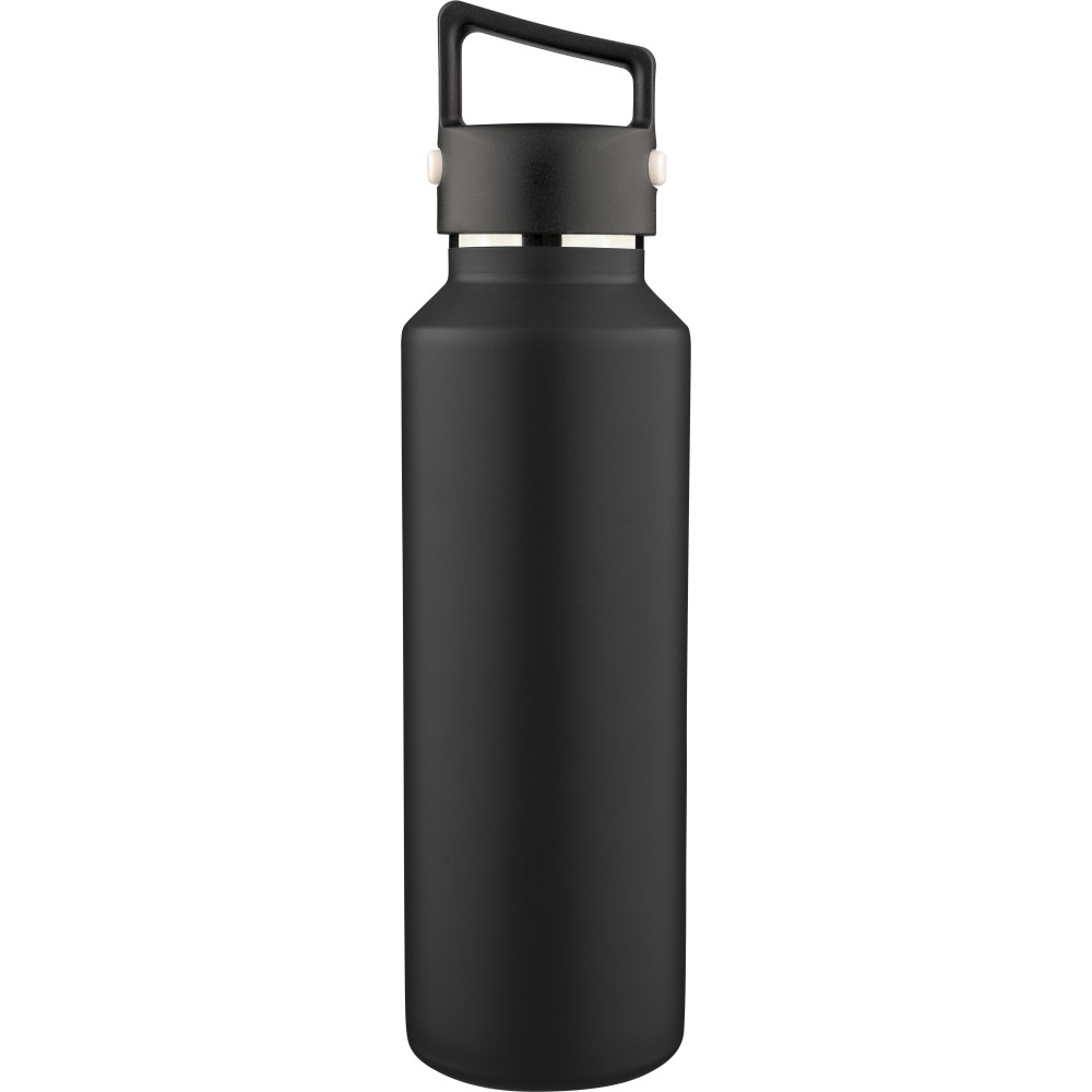 Újrahasznosított rozsdamentes acélból készült, vákuumszigetelésű palack 600 ml űrtartalommal, duplafalú kialakítással, hordozófüllel ellátott PP fedéllel és kétféle (dupla) nyitási lehetőséget biztosító nyomógombos rendszerrel. A palacktesten lézergravírozott recycled (újrahasznosított) alapanyagra utaló logó található. Darabonként barna kartondobozba csomagolva.