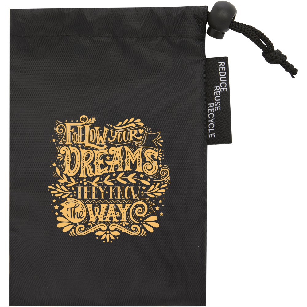 Újrahasznosított poliészterből (RPET) készült jógaszalag. Az RPET használata segít csökkenteni a pazarlást és elősegíti a környezet fenntarthatóságát. Az újrahasznosított műanyagok felhasználásával az új műanyagok keletkezése minimálisra csökken, így fenntarthatóbb választás. Mérete: 181 x 3,8 cm. A tasak is RPET-ből készült.