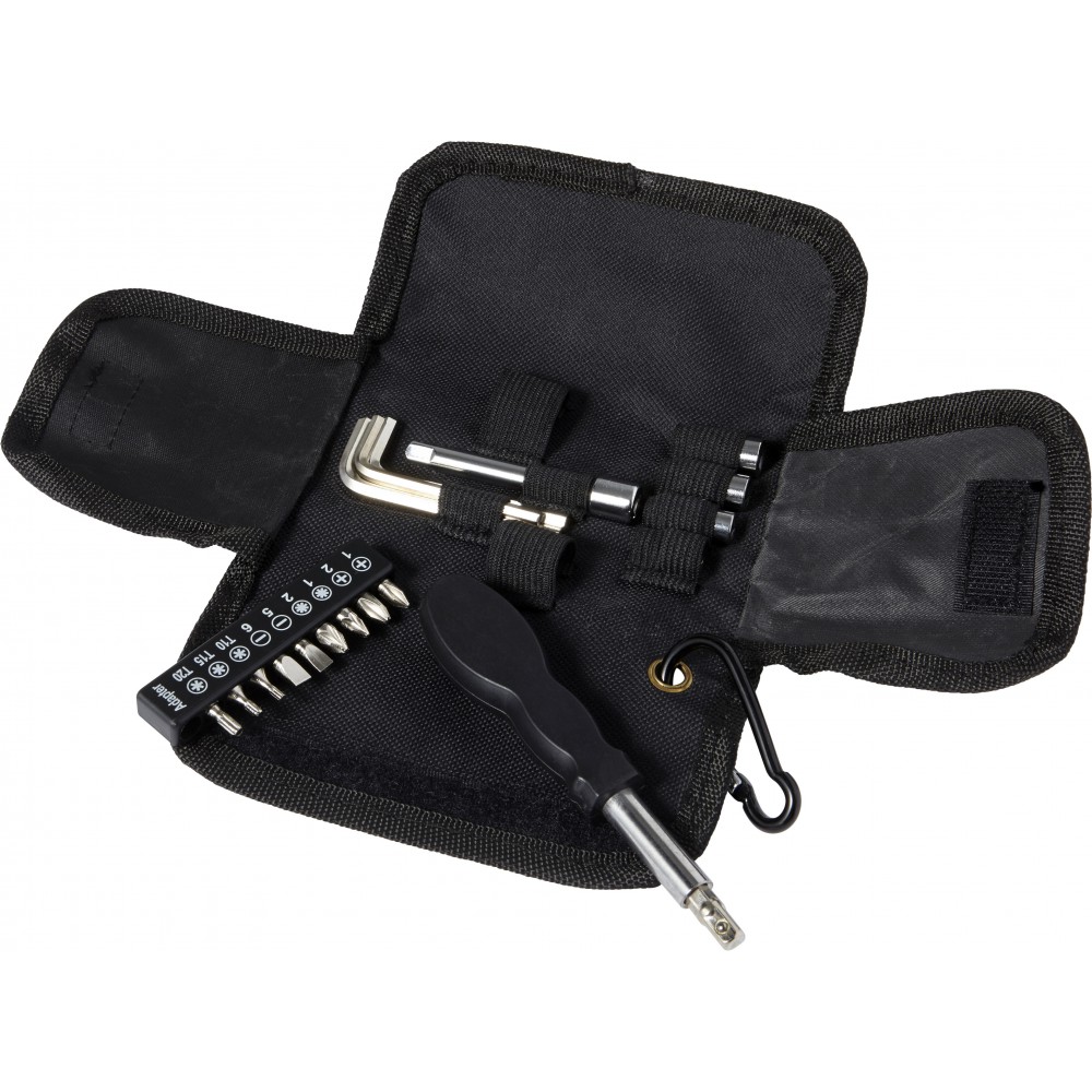 20 darabos szerszámkészlet 600D oxford anyagú tartóban, tépőzáras záródással, karabineres akasztóval. A táska tartalma: csavarhúzó, 3 db hex kulcs, 4 db befogófej, 10 db csavarhegy, 1 db hosszabbító nyél.