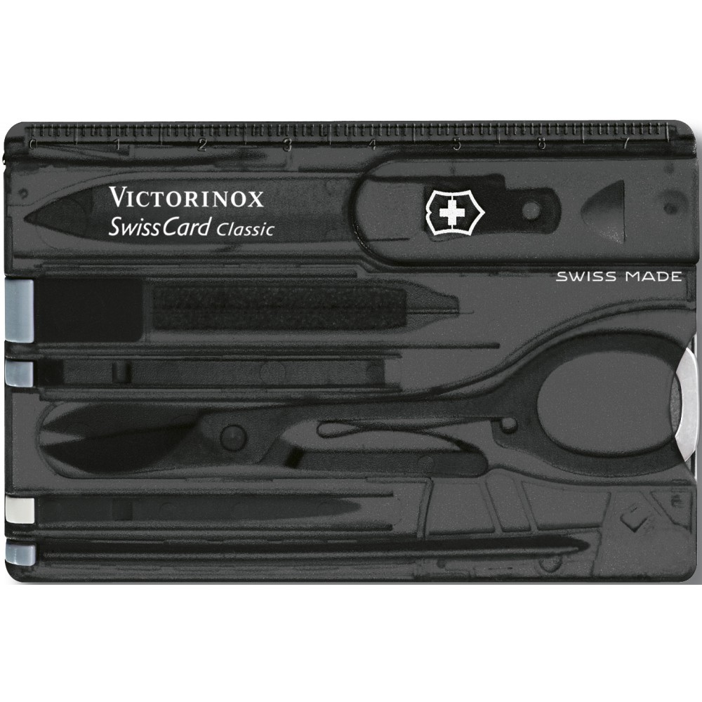 Victorinox SwissCard Classic multifunkcionális eszköz, amely tartalmazza: levélnyitó, csipesz, olló, körömreszelő, fogpiszkáló, golyóstoll és acéltű. Egyedileg díszdobozba csomagolva.