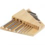 Az Allen bambusz imbuszkulcs készlet nélkülözhetetlen, akár barkácsprojektekkel foglalkozol, akár bútorokat szerelsz össze. A készlet 8 db, strapabíró szénacélból készült imbuszkulcsot tartalmaz, amelyek mind szilárdságot, mind korrózióállóságot biztosítanak. A 1,5 mm-től 6 mm-ig terjedő méretekkel kéznél lesz a megfelelő szerszám a különféle feladatokhoz. A bambusz tok nemcsak rendben tartja hatlapfejű kulcsait, hanem stílusos, praktikus és fenntarthatóbb kiegészítője a munkaterületnek. Mivel a bambusz természetes alapanyag, darabonként előfordulhatnak kis szín- és méretbeli eltérések, ami befolyásolhatja a végső emblémázási eredményt. Fenntartható forrásból származó STAC díszdobozba csomagolva.