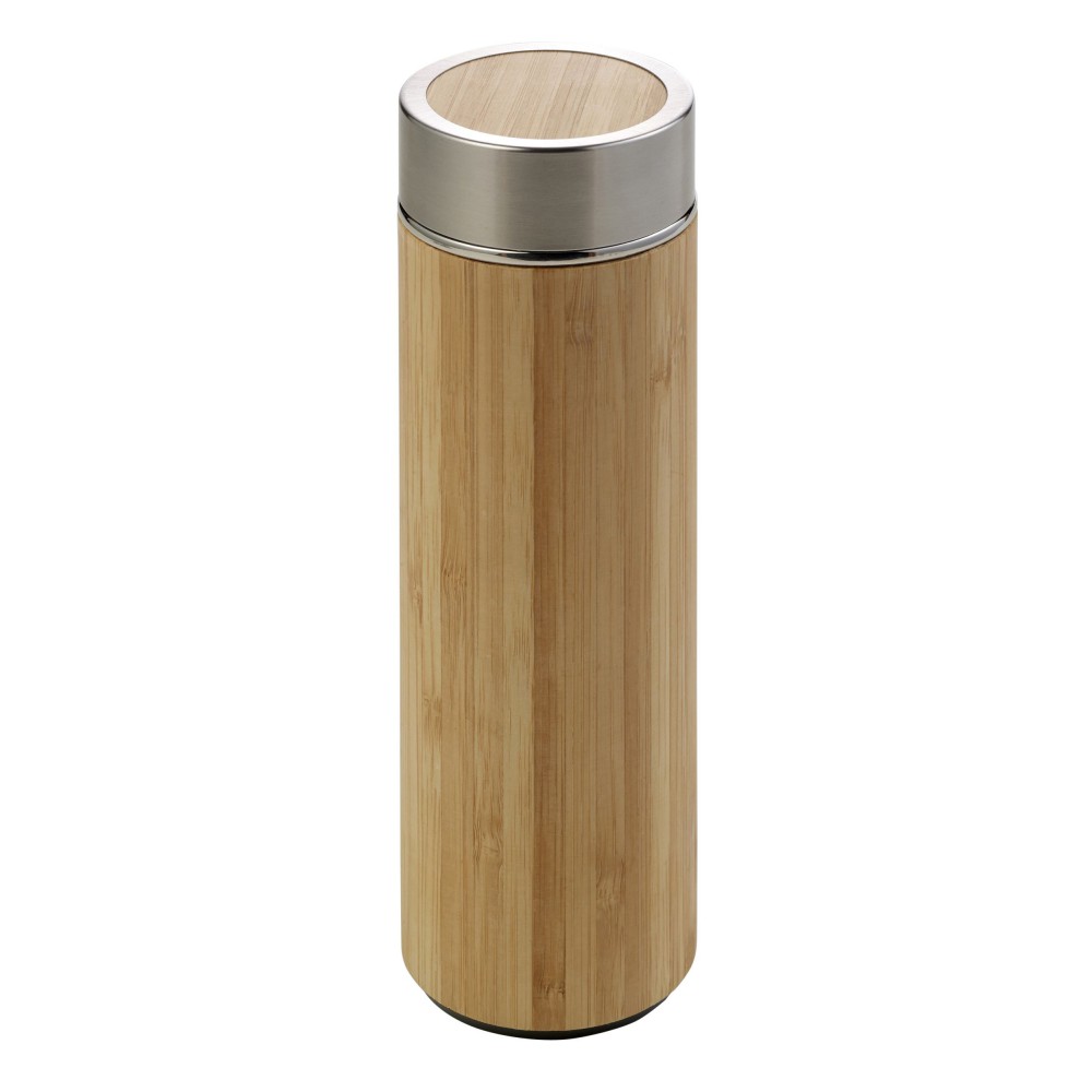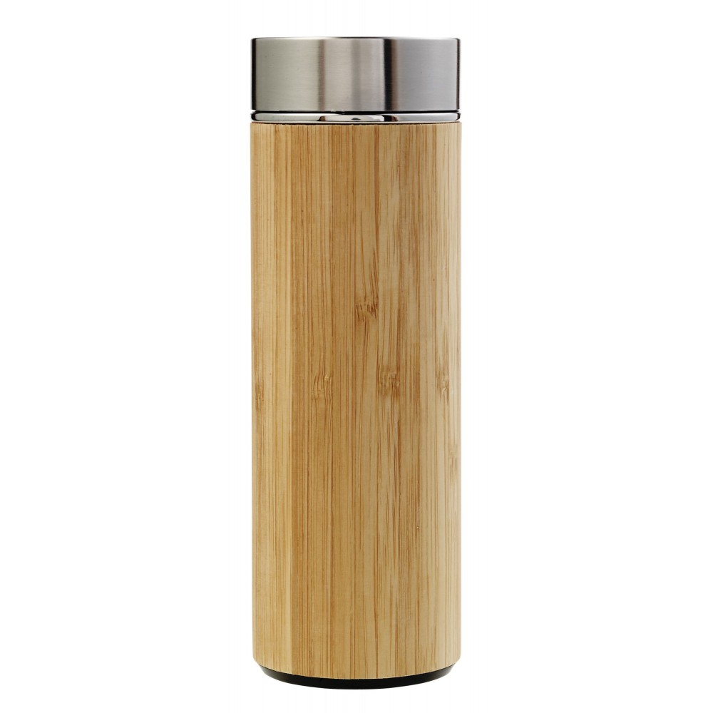 Duplafalú, vákuumos termosz fém teaszűrővel. Űrtartalom: 420 ml. Bambusz és rozsdamentes acél. Csomagolása fehér papírdoboz.