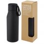 Réz vákuumszigetelt rozsdamentes acél palack klasszikus és elegáns dizájnnal. PU bőr szíjjal és részlettel a fedélen. Ez ideálissá teszi a lézergravírozáshoz, amely a logót ezüst színben emeli ki, gyönyörű vizuális hatást hozva létre. A 18/8-as rozsdamentes acél duplafalú réz vákuumszigetelésével az italok több órán keresztül melegek vagy hidegek maradnak. A német élelmiszerbiztonsági jogszabályok (LFGB) szerint tesztelték és jóváhagyták, és a REACH előírásai szerint tesztelték a ftaláttartalmat. Szivárgásmentes. Szénsavas italokkal nem használható. Mosogatógépben nem mosható és mikrohullámú sütőben történő melegítésre nem alkalmas. Űrtartalom: 500 ml. Újrahasznosított karton díszdobozban.