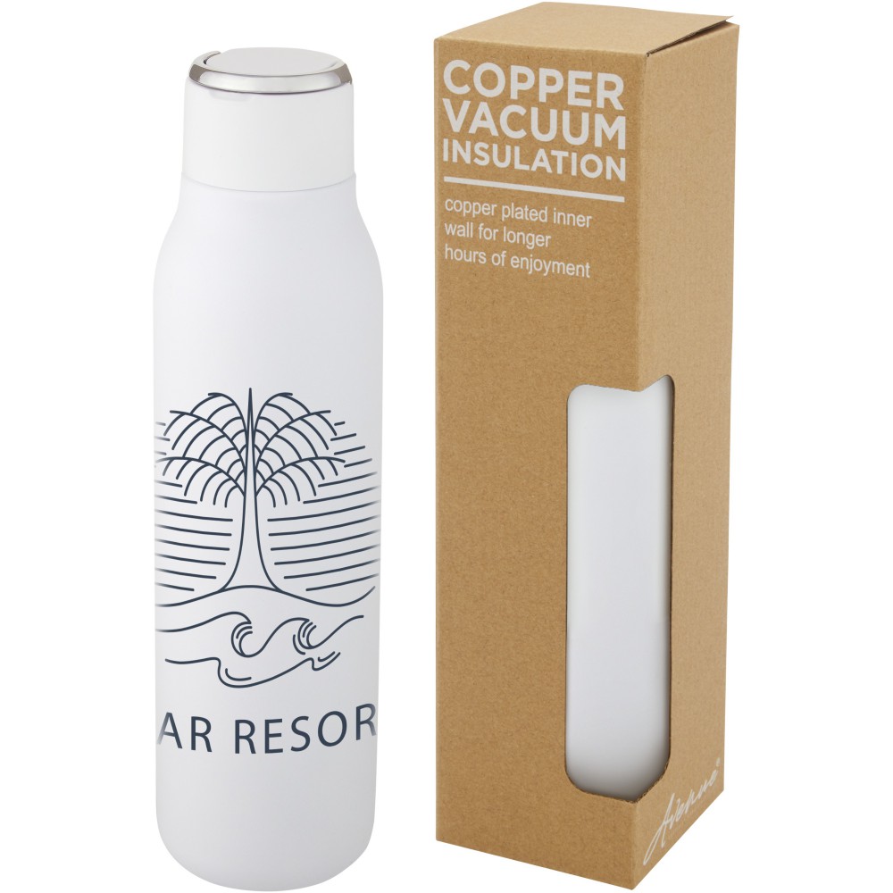 A Marka palack rozsdamentes acél vákuumkonstrukcióval és rézszigeteléssel rendelkezik, amely több órán keresztül melegen vagy hidegen tartja az italokat. A szigetelt 18/8-as rozsdamentes acél konstrukció megakadályozza a páralecsapódást a palack külső oldalán, a divatos porszórt felület pedig extra tartóssá teszi. Felcsavarható fedéllel és tartós, cinkötvözetből készült fogóval is rendelkezik. BPA-mentes, a német élelmiszerbiztonsági törvény (LFGB) szerint tesztelt és jóváhagyott. Ftaláttartalomra tesztelve és jóváhagyva a REACH előírásai szerint. A legtöbb szabványos autós pohártartóba illeszkedik. Szivárgásmentes. Szénsavas italokkal nem használható. Mosogatógépben nem mosható és mikrohullámú sütőben történő melegítésre nem alkalmas. Űrtartalom: 600 ml. Újrahasznosított karton díszdobozban.