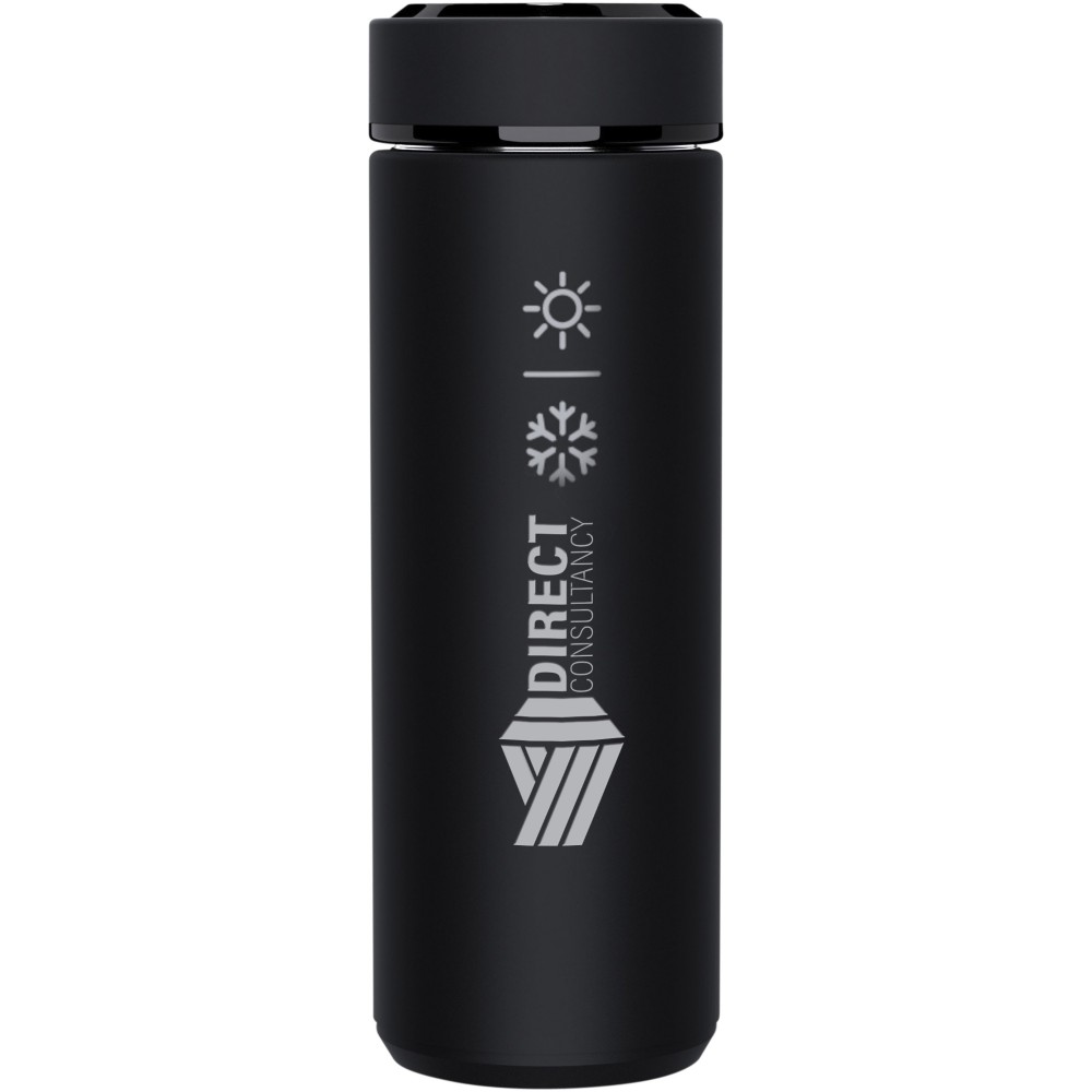 Duplafalú 500 ml-es szigetelt, rozsdamentes palack antibakteriális kezeléssel és hőmérséklet-érzékelővel. A Touch & Light rendszernek köszönhetően az ital hőmérséklete megjelenik a palack kupakján (Celsius fokban). Meleg és hideg italokhoz egyaránt alkalmas. Újrahasznosított papírból készült, hengeres díszdobozban szállítjuk. Mérete: d: 47 x 225 mm. Elem: CR 2450 (3V). Az akkumulátor nem cserélhető. 20 000-szer képes megjeleníteni a hőmérsékletet.