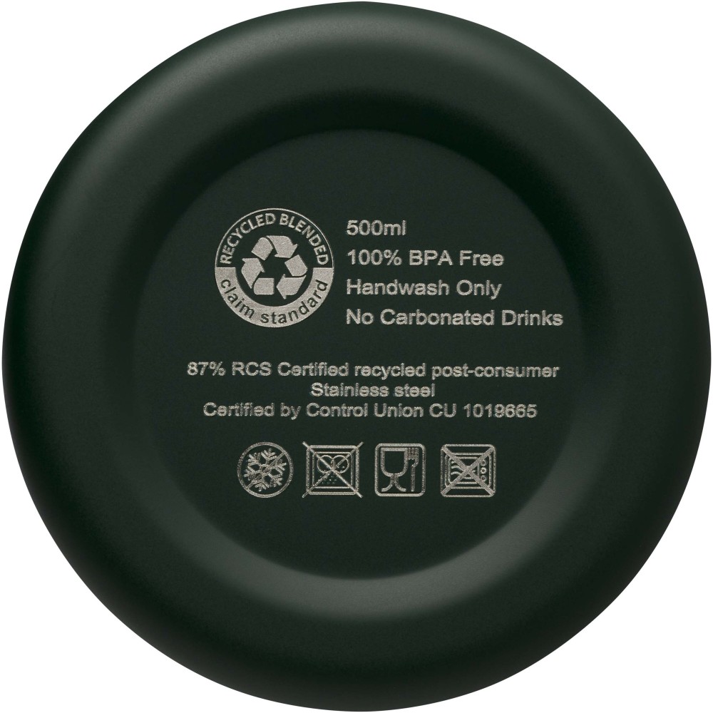 Rézvákuum szigetelésű, RCS tanúsítvánnyal rendelkező rozsdamentes acél palack letisztult dizájnnal. Az szigetelt rozsdamentes acél szerkezet megakadályozza a kondenzációt a palack belsejében, és a trendi matt porfestett felület extra tartóssá teszi. BPA-mentes, német élelmiszerbiztonsági jogszabály (LFGB) szerint tesztelt és jóváhagyott. Ftalát-tartalom szerint REACH szabályozásoknak megfelelően tesztelt és jóváhagyott. Űrtartalom: 500 ml. Kézi mosogatás javasolt. Újrahasznosított kartondobozban szállítjuk.