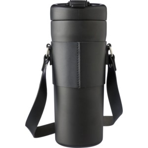 Duplafalú palack PU hordozótokkal, szívószállal és pánttal. A belső rész 304-es rozsdamentes acélból, a külső rész 201-es rozsdamentes acélból készült. PP fedél nyomógombbal a kifolyó nyitásához vagy zárásához, valamint külön ivónyílással. A tartalmát 6 órán át melegen és 10 órán át hidegen tartja. Egyenként barna kartondobozba csomagolva. Űrtartalom: 730 ml.