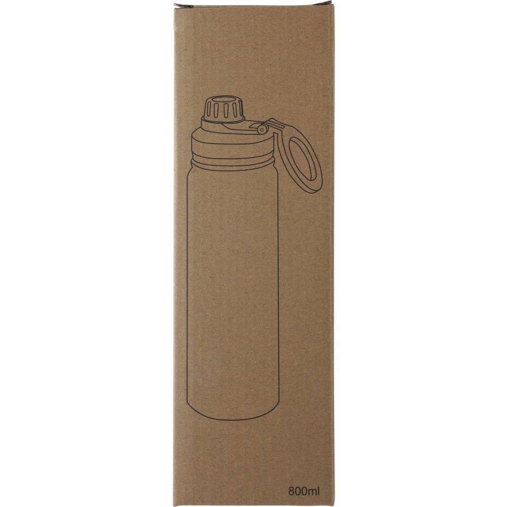 800 ml-es duplafalú palack. A belső 304-es, a külső 201-es rozsdamentes acélból készült. Csavaros PP kupakkal, mely fogantyúként és erős, mágneses telefontartóként is használható. Mosogatógépben nem tisztítható. Csomagolása barna papírdoboz.