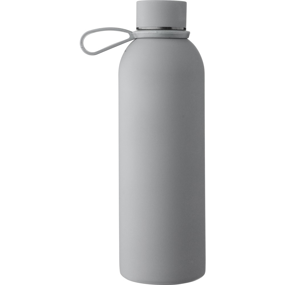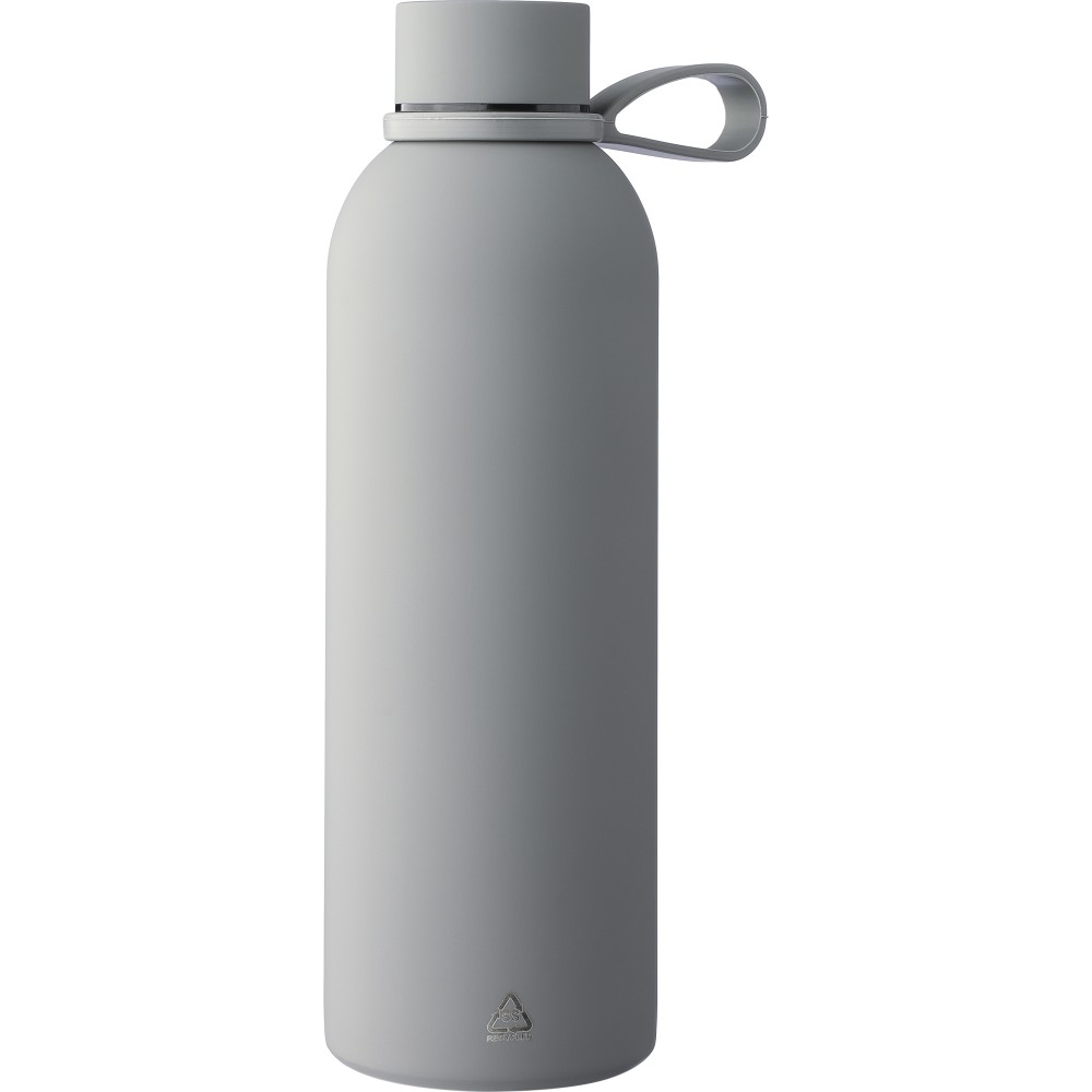 Újrahasznosított rozsdamentes acélból készült duplafalú vákuumpalack, 500 ml-es. 304-es rozsdamentes acél belsővel és 201-es rozsdamentes acél külsővel. Gumírozott felülettel, fém díszítésű csavaros PP kupakkal és szilikon hordfüllel. Gravírozott, újrahasznosított logóval. Csomagolása barna papírdoboz.