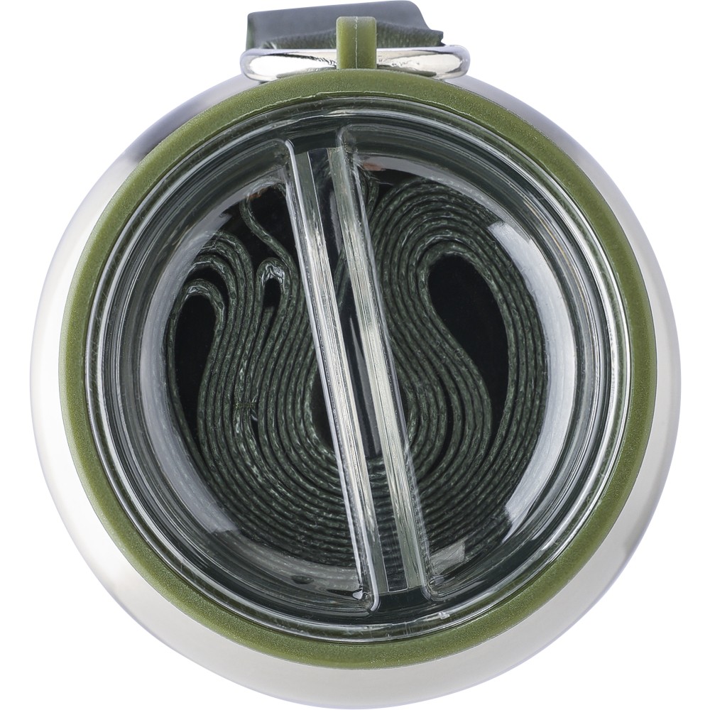 Duplafalú rozsdamentes acél kulacs, 500 ml-es. 304-es rozsdamentes acél belsővel és 201-es rozsdamentes acél külsővel. Átlátszó rekesszel ellátott PP csavaros kupakkal, cserélhető poliészter csuklópánttal, valamint egy 200 ml-es PP pohárral az alján. Ezüst színű felület matt részletekkel. Csomagolása barna papírdoboz.
