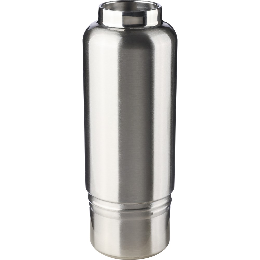 Duplafalú rozsdamentes acél kulacs, 500 ml-es. 304-es rozsdamentes acél belsővel és 201-es rozsdamentes acél külsővel. Átlátszó rekesszel ellátott PP csavaros kupakkal, cserélhető poliészter csuklópánttal, valamint egy 200 ml-es PP pohárral az alján. Ezüst színű felület matt részletekkel. Csomagolása barna papírdoboz.