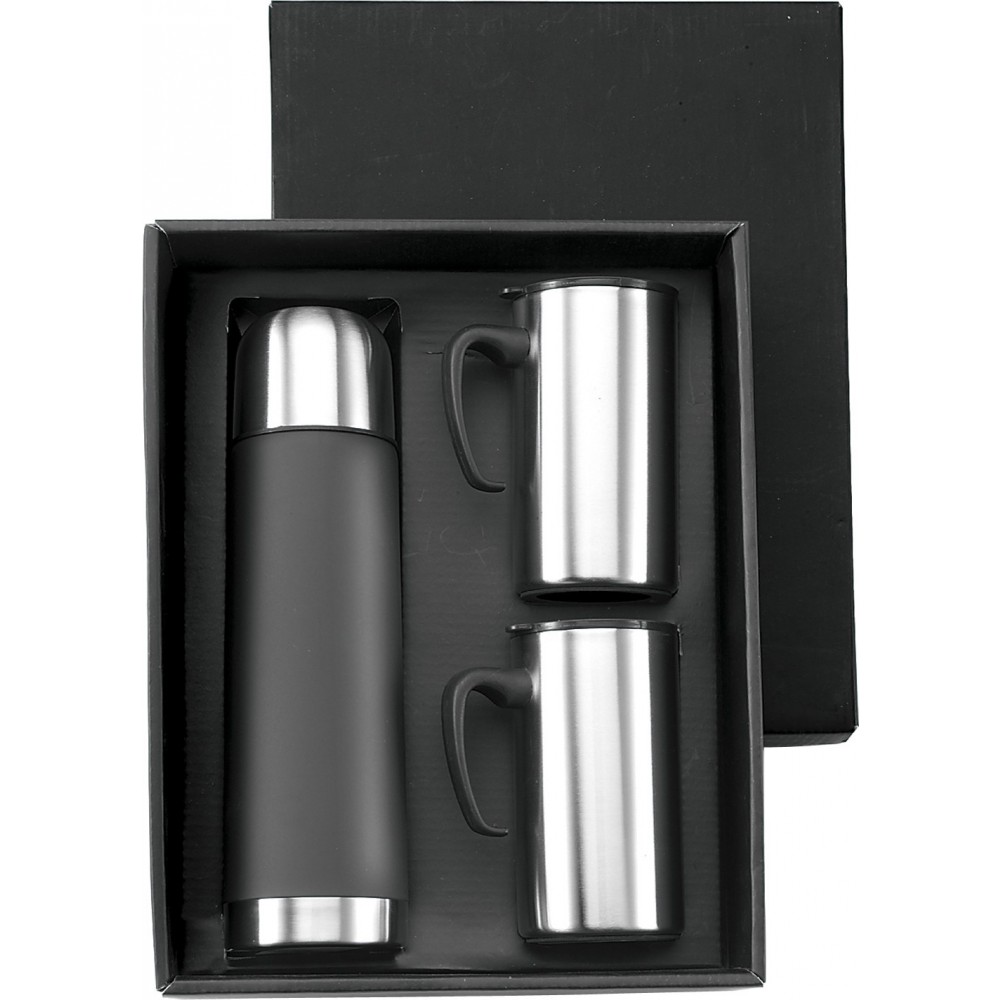 500 ml-es termosz 2 db 300 ml-es bögrével. Rozsdamentes acél, díszdobozban. Nem szivárgásmentes. Mosogatógépben nem tisztítható.