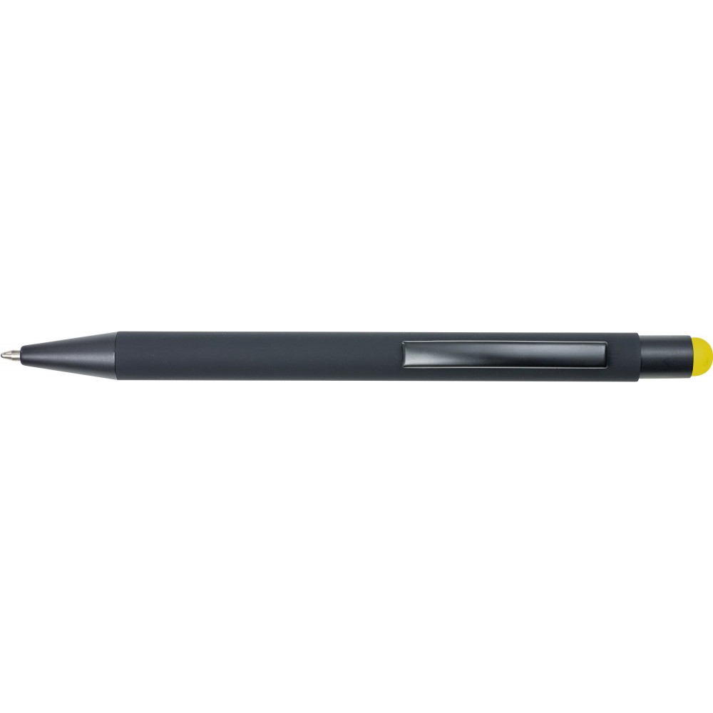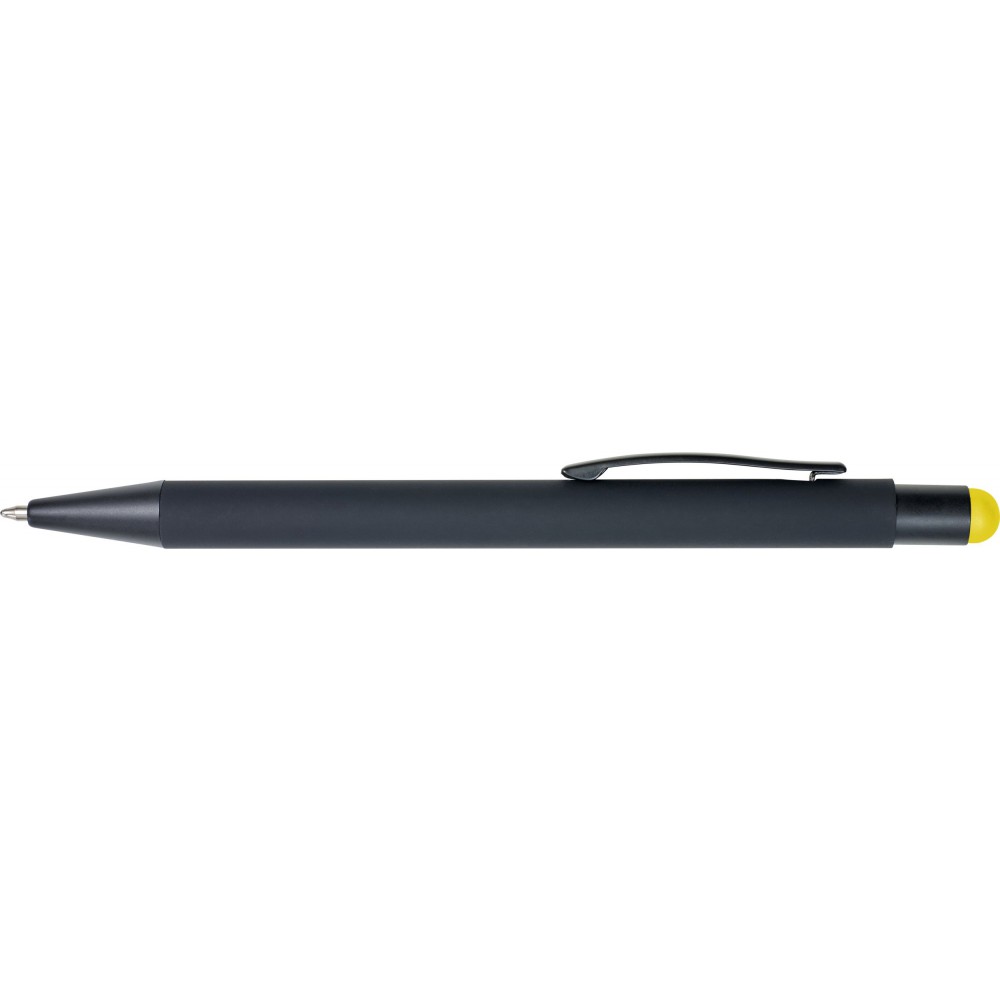 Golyóstoll színes érintővel, kék tollbetéttel és színes belső felülettel. ABS műanyag és alumínium.
