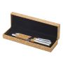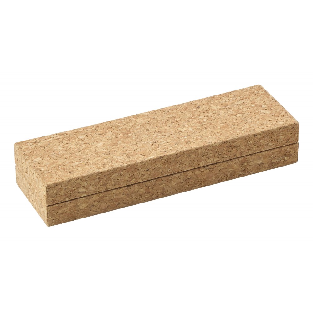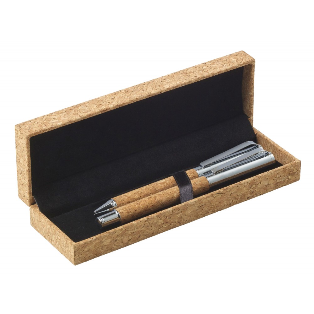 Tollkészlet golyóstollal és rollerball tollal. Parafa tolltestek króm kiegészítőkkel, kék tollbetéttel. Parafa tolldoboz bársony béléssel.
