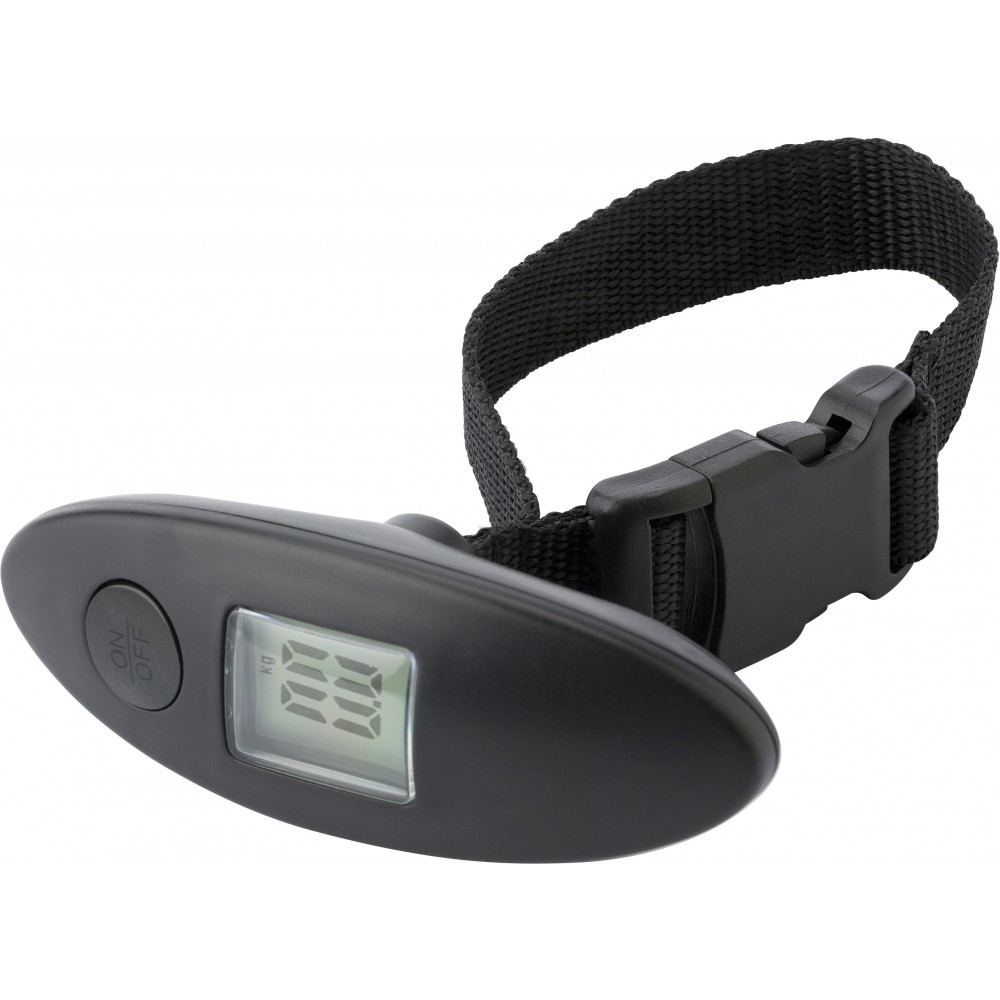ABS digitális poggyászmérleg max. 40 kg-os csomag méréséhez, ki/bekapcsoló gombbal, csuklópánttal. Az elemet tartalmazza.