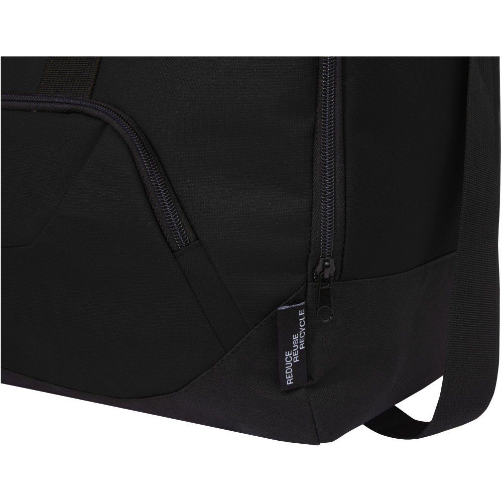 Erős táska 100% -ban újrahasznosított műanyagból, amellyel hozzájárul a műanyag hulladék csökkentéséhez. Nagyméretű fő rekesz és első cipzáras zseb, párnázott vállpánt és párnázott fogantyú. Körülbelül 27 műanyagpalack újrahasznosításával készült. 600D poliészter.
