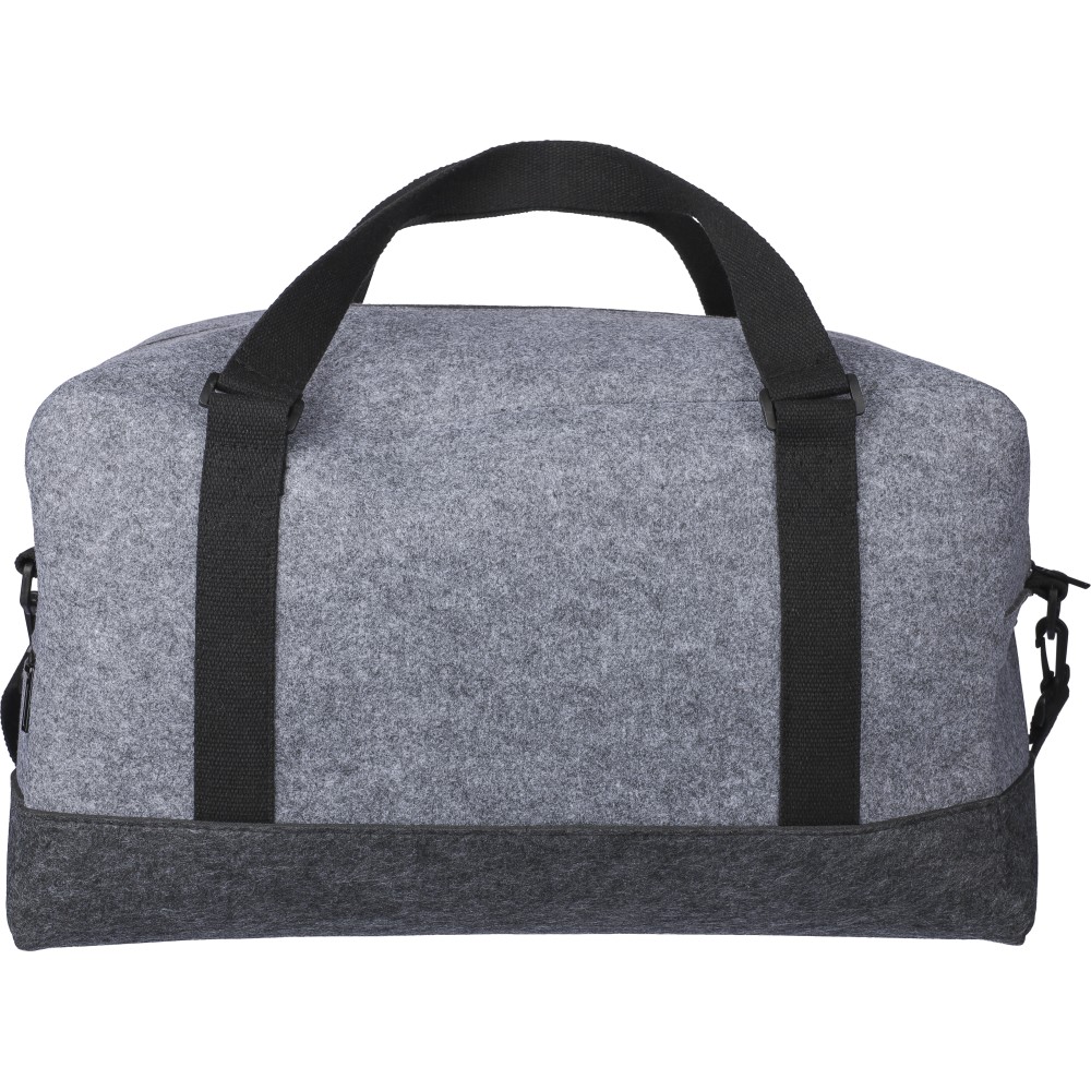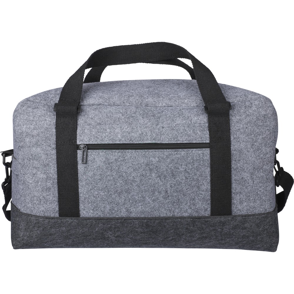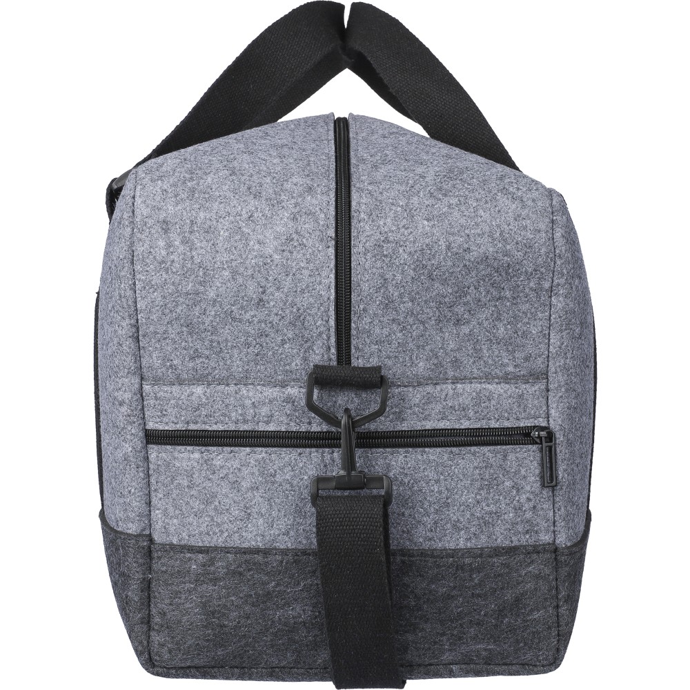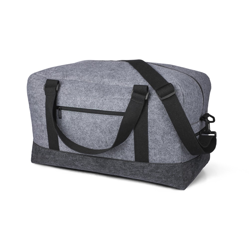 Sporttáska rPET filc anyagból vászon fülekkel és állítható vállpánttal. Egy nagy cipzáras rekesszel és a táska elején egy kicsi cipzáras zsebbel. rPET címkével. Úrtartalom: 30 liter, teherbíró képesség: 10 kg.