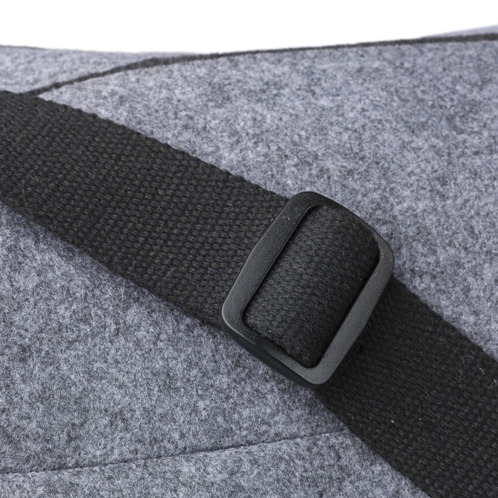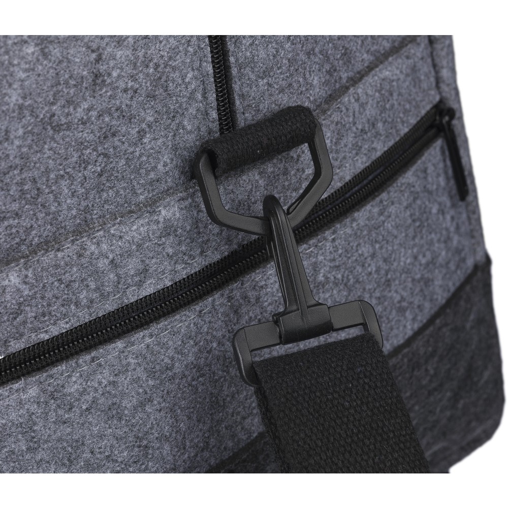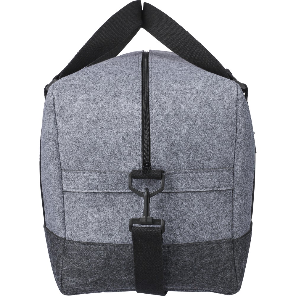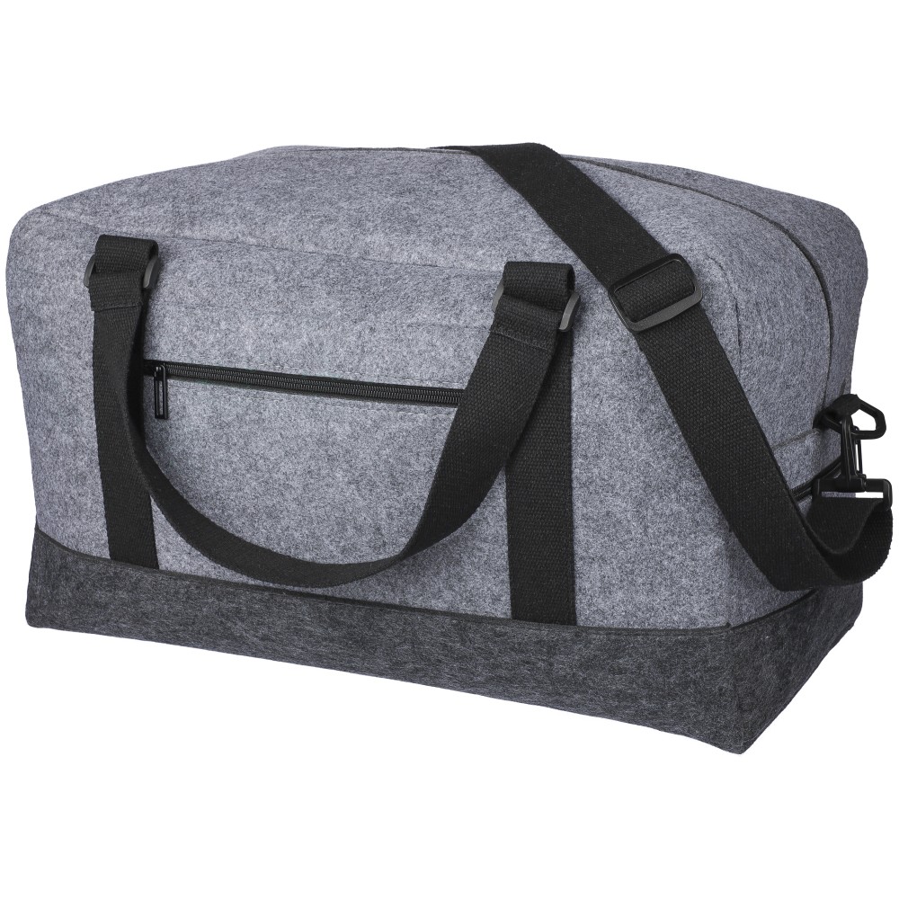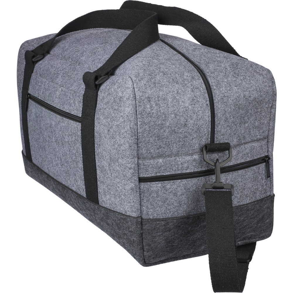 Sporttáska rPET filc anyagból vászon fülekkel és állítható vállpánttal. Egy nagy cipzáras rekesszel és a táska elején egy kicsi cipzáras zsebbel. rPET címkével. Úrtartalom: 30 liter, teherbíró képesség: 10 kg.