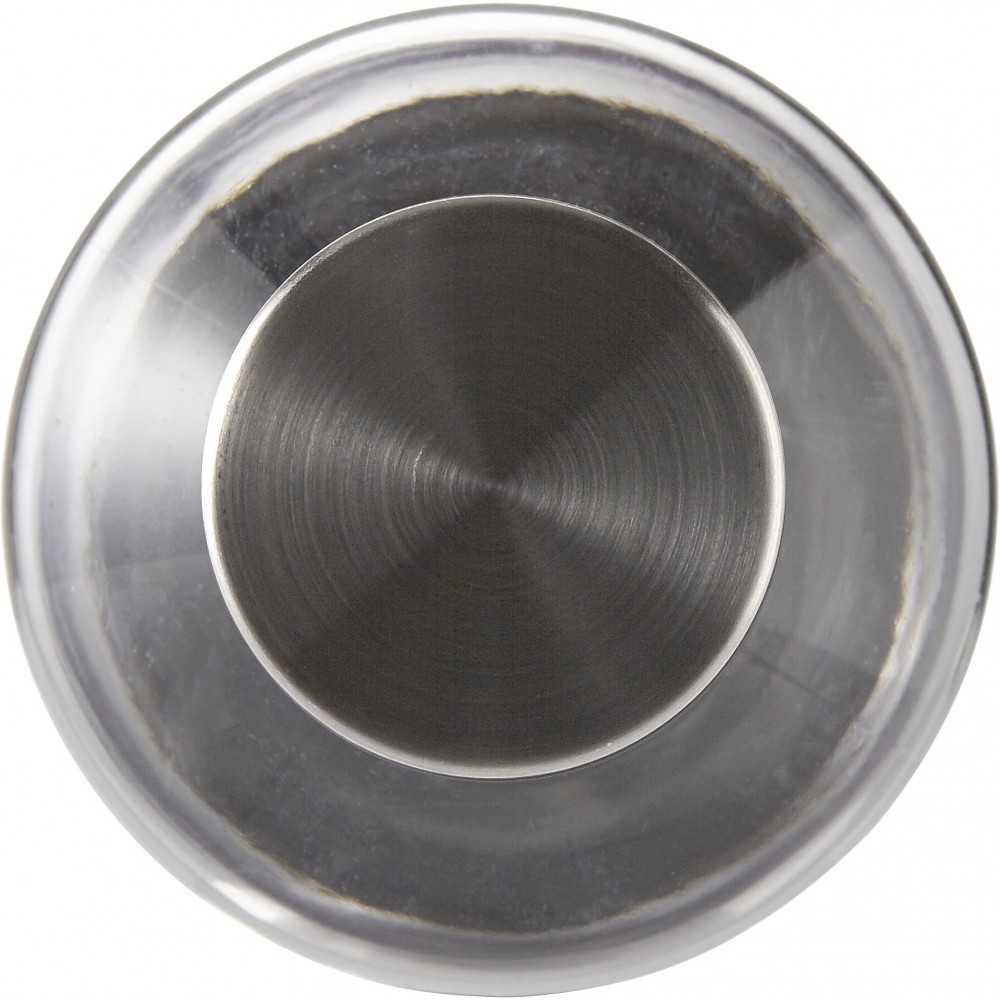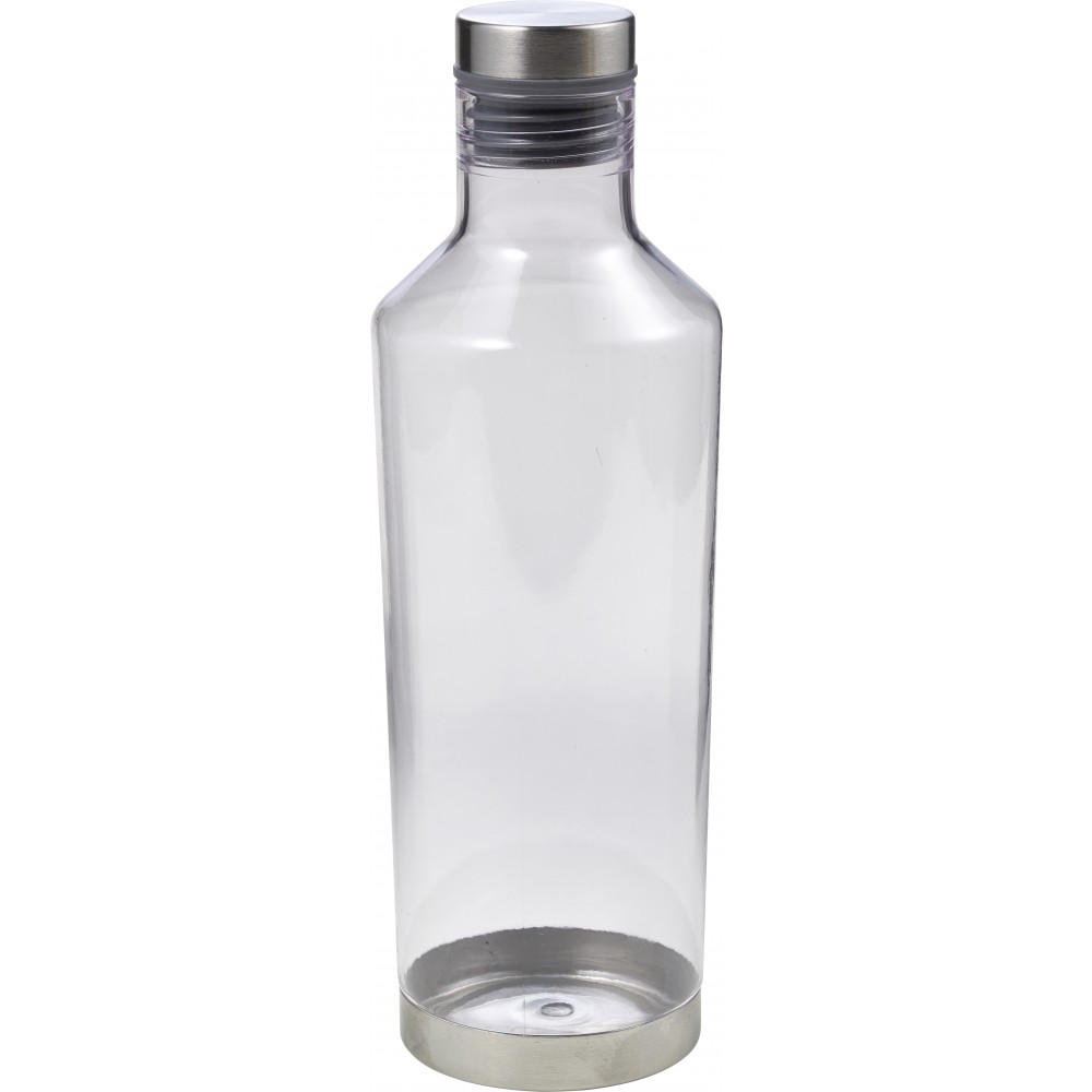 Átlátszó vizespalack fém alsó résszel és fém csavaros kupakkal. A kupak gumigyűrűje színben illeszkedik a palack színével. 850 ml. Nem szivárgásmentes. Mosogatógépben nem tisztítható. BPA-mentes műanyag.